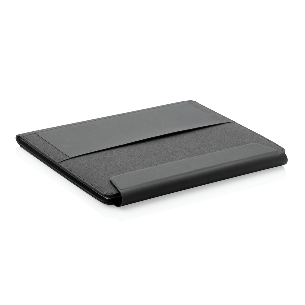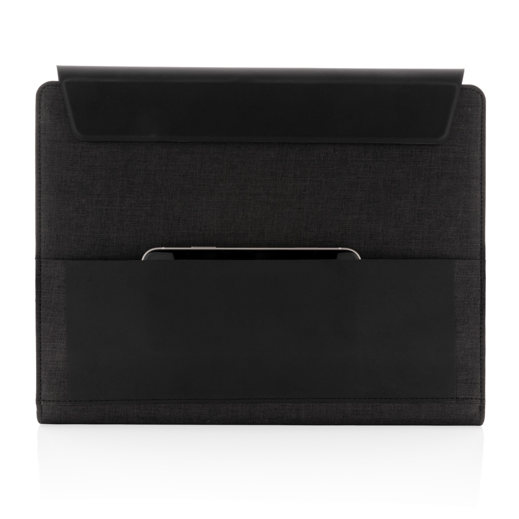 Красивый и практичный: этот портфель формата А4 предлагает возможность беспроводной зарядки, чтобы вы всегда были на связи. Входящий в комплект внешний внешний аккумулятор можно использовать и отдельно. Элегантный портфель оснащен встроенной беспроводной зарядной подставкой для телефона, эластичной петлей для ручки, 3 отделениями для визиток и дополнительными карманами. В блокнот входит 20 листов линованной бумаги кремового цвета плотностью 80 г/м². Изготовлен из смеси полиэстера и полиуретана. Вход: 5 В/2 А; Выход: 5 В/2 А. Беспроводной вход 5 В/2 А, выход 5 В/1 А. Поставляется в полноцветной подарочной коробке.