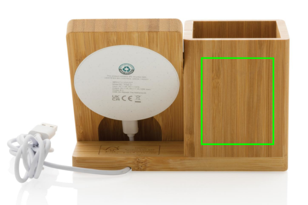 10 Вт беспроводное быстрое зарядное устройство с держателем для ручки изготовлено из переработанного АБС-пластика, сертифицированного по стандарту RCS (Recycled Claim Standard). Общее содержание переработанных материалов: 6% от общего веса изделия (включая бамбуковое основание). Бамбуковая внешняя часть органайзера полностью изготовлена из бамбука FSC 100. Включает 120-сантиметровый кабель для зарядки типа C из переработанного ТПЭ, сертифицированного по стандарту RCS. Упаковано в коробку из крафт-бумаги FSC mix. Вход Type-C 5 В/2 А; 9 В/1,67 А. Беспроводной выход 5 В/1 А; 9 В/1,1 А (10 Вт) Зарегистрированный дизайн®