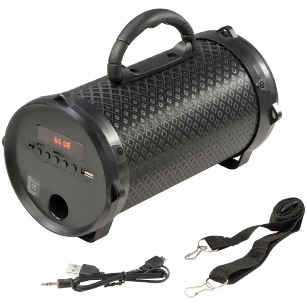 Bluetooth-динамик с множеством функций: FM-радио, порт AUX, воспроизведение MP3 через карты Micro SD или USB-слот, в комплект входит USB-кабель для зарядки с разъемом 3,5 мм, а также съемный ремень для переноски и время работы аккумулятора 2 часа. Ваш логотип будет напечатан на корпусе.