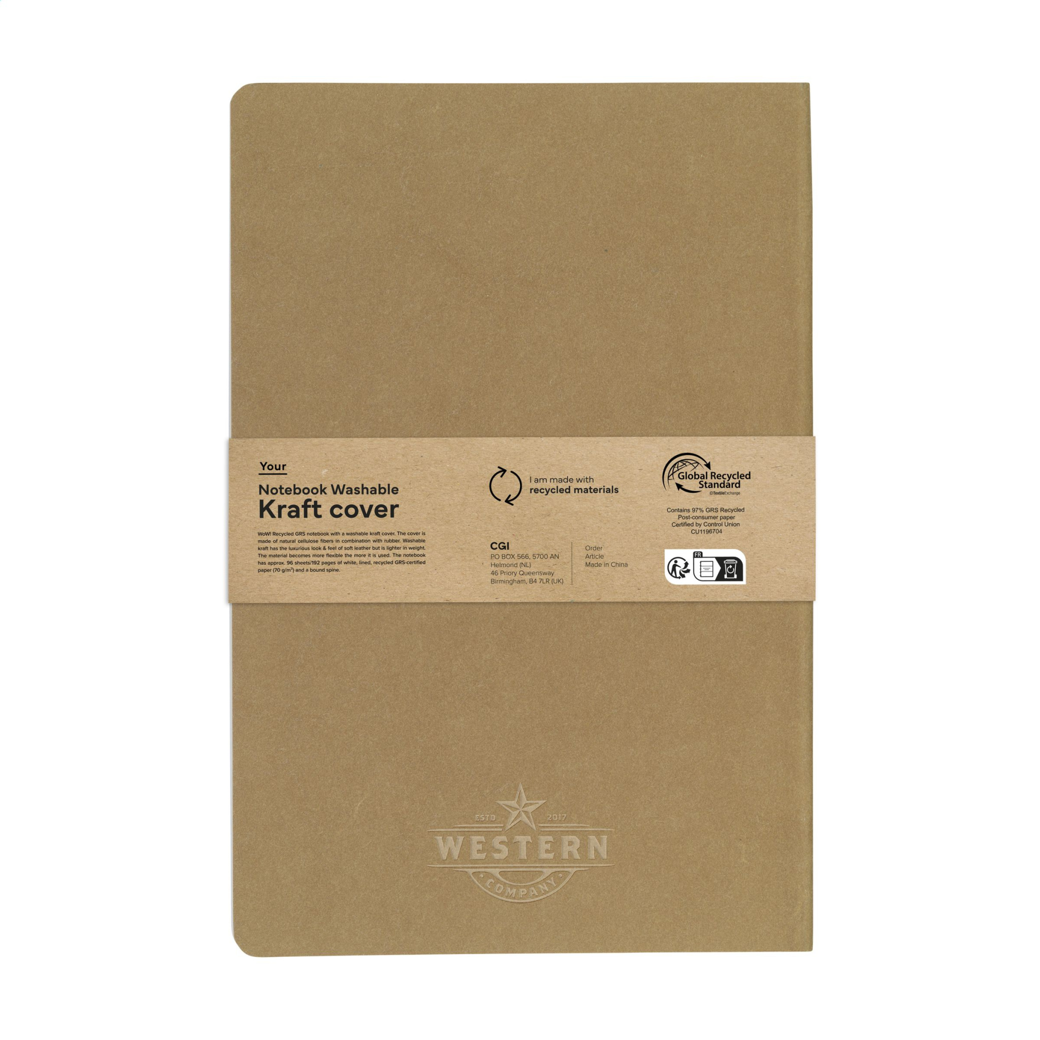 WoW! Переработанный блокнот формата А5 с моющейся крафт-обложкой. Обложка изготовлена из натуральных целлюлозных волокон в сочетании с резиной. Моющийся крафт имеет роскошный вид и ощущение мягкой кожи, но легче по весу. Материал становится более гибким по мере использования. В блокноте примерно 96 листов/192 страницы белой, линованной, переработанной бумаги, сертифицированной GRS (70 г/м²), и переплетенный корешок. Сертификация GRS. Общее количество переработанного материала: 97%.