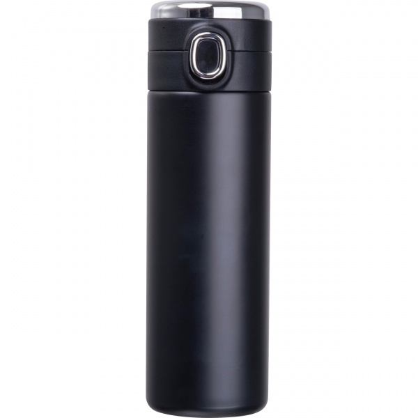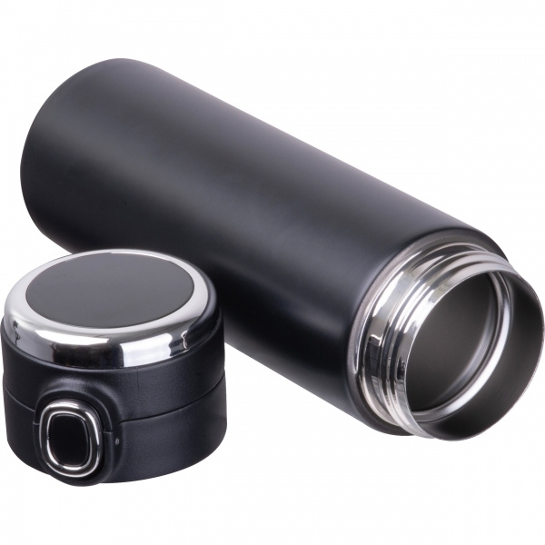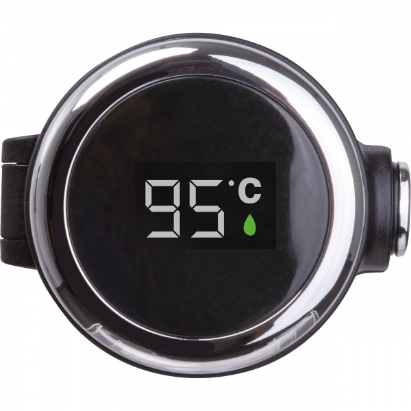 Бутылка из нержавеющей стали с вакуумной изоляцией, индикатором температуры в крышке и предохранительным замком. Максимальная отображаемая температура: 99°C. Ваш логотип наносится на бутылку лазерной гравировкой.