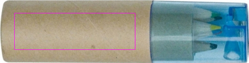Картонная коробка с шестью короткими, толстыми цветными карандашами и встроенной точилкой с синей прозрачной пластиковой крышкой. Мы нанесем ваш логотип на коробку методом тампопечати.