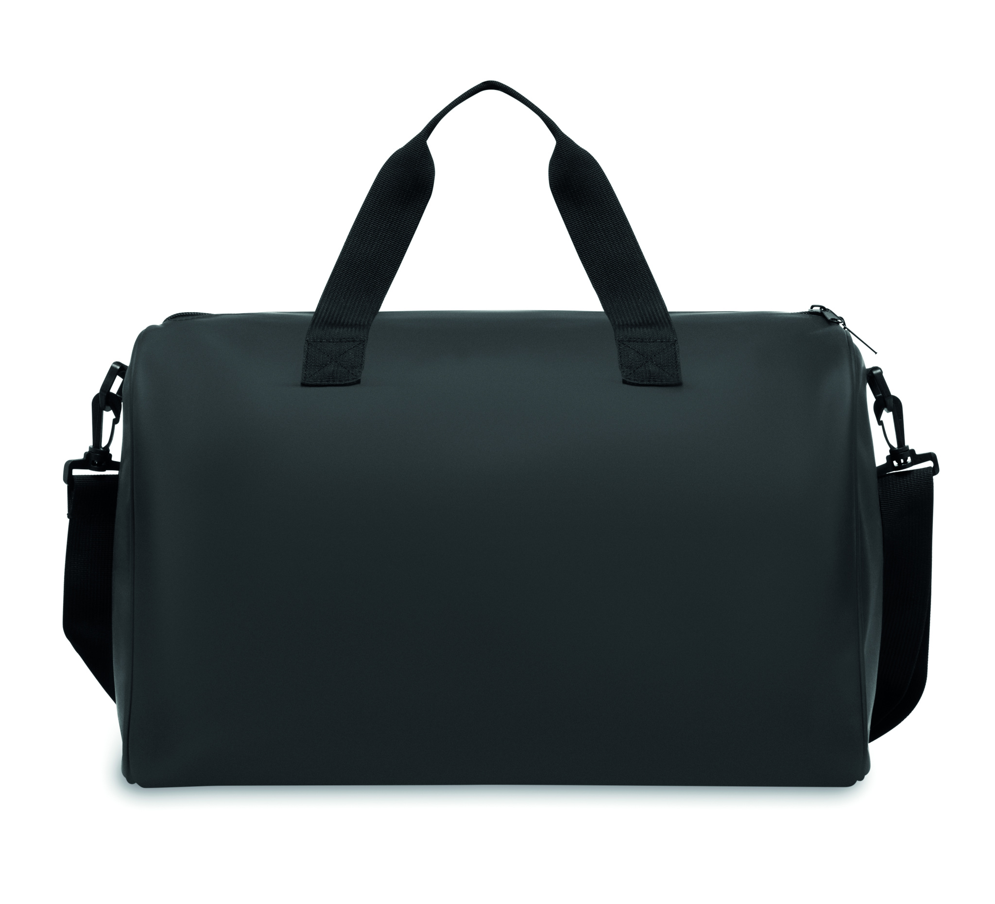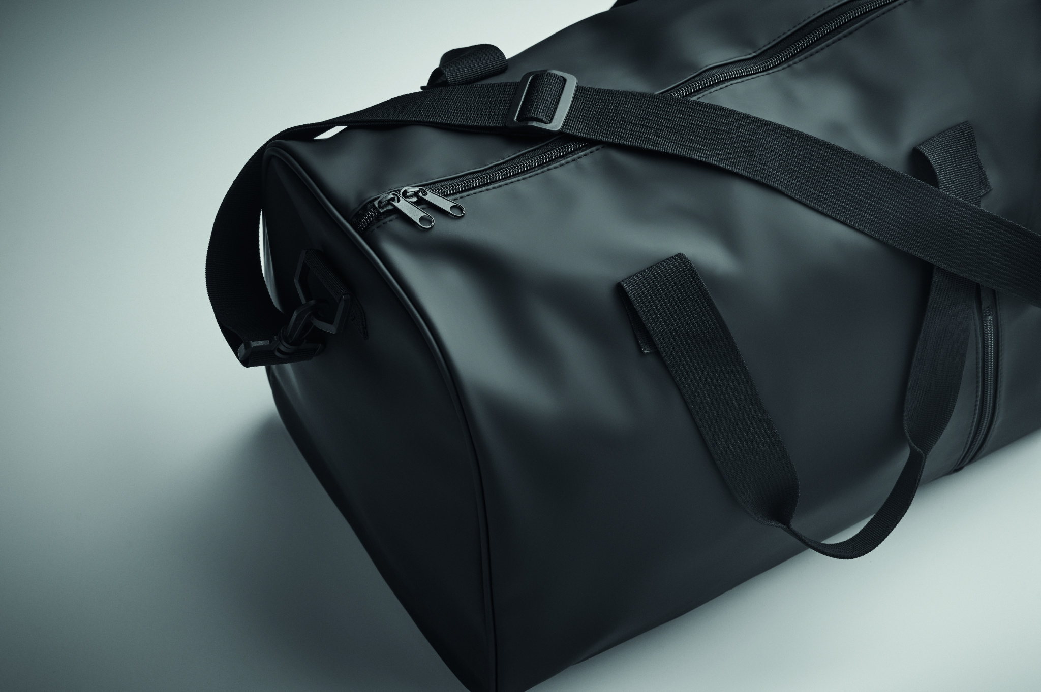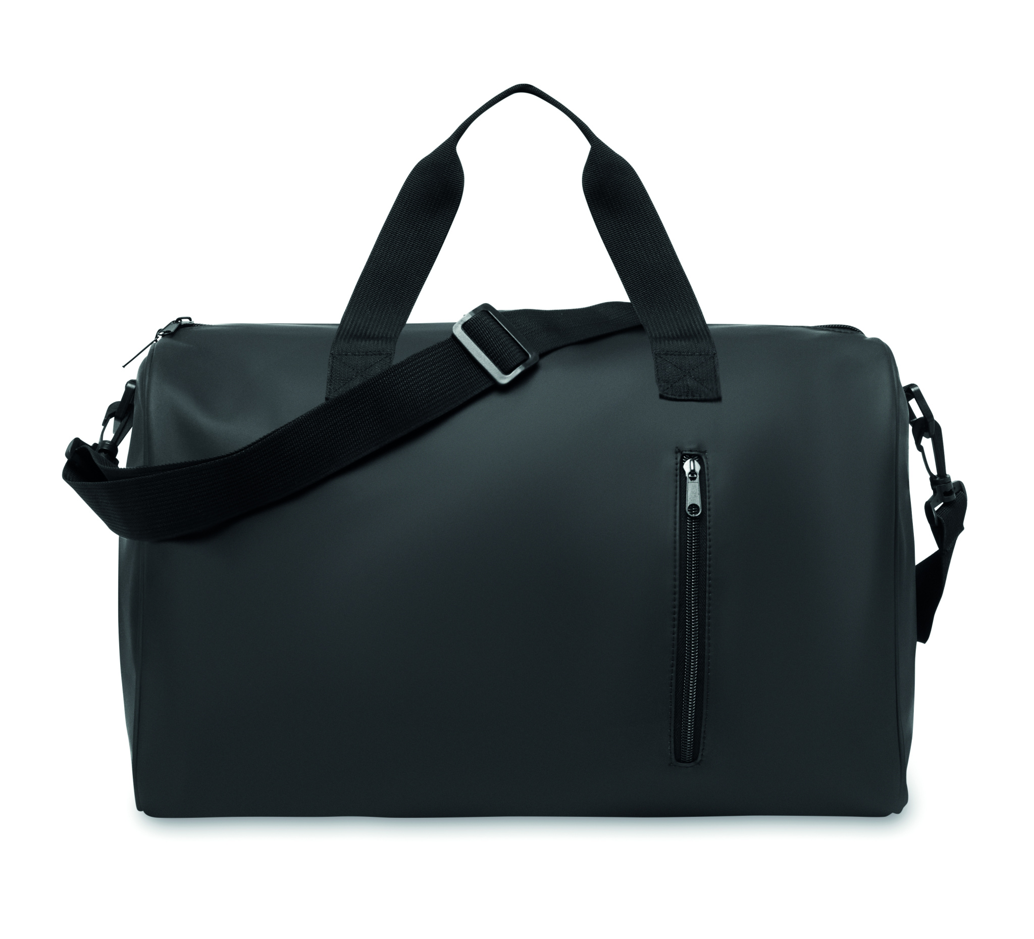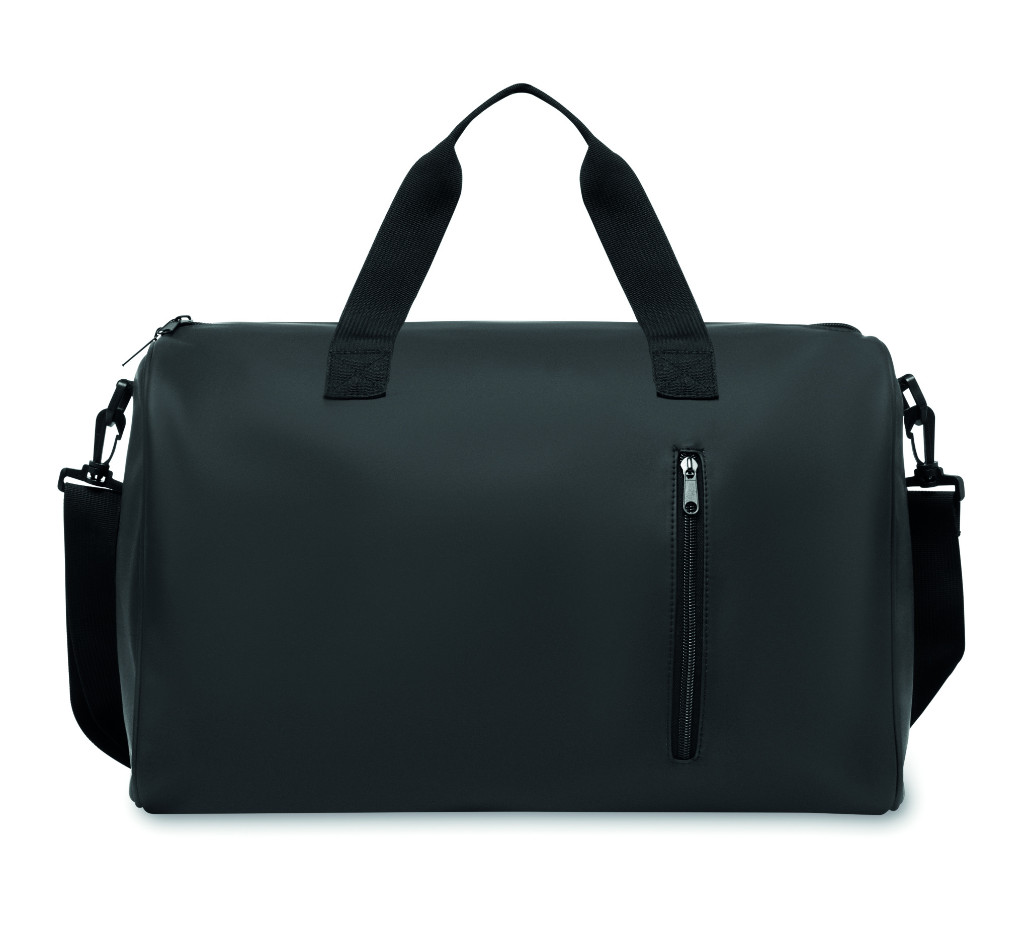 Duffle bag in soft PU with foam reinforcement to the base. One main compartment, zippered front pocket. 210D RPET polyester lining. 2 handles and one adjustable and detachable shoulder strap