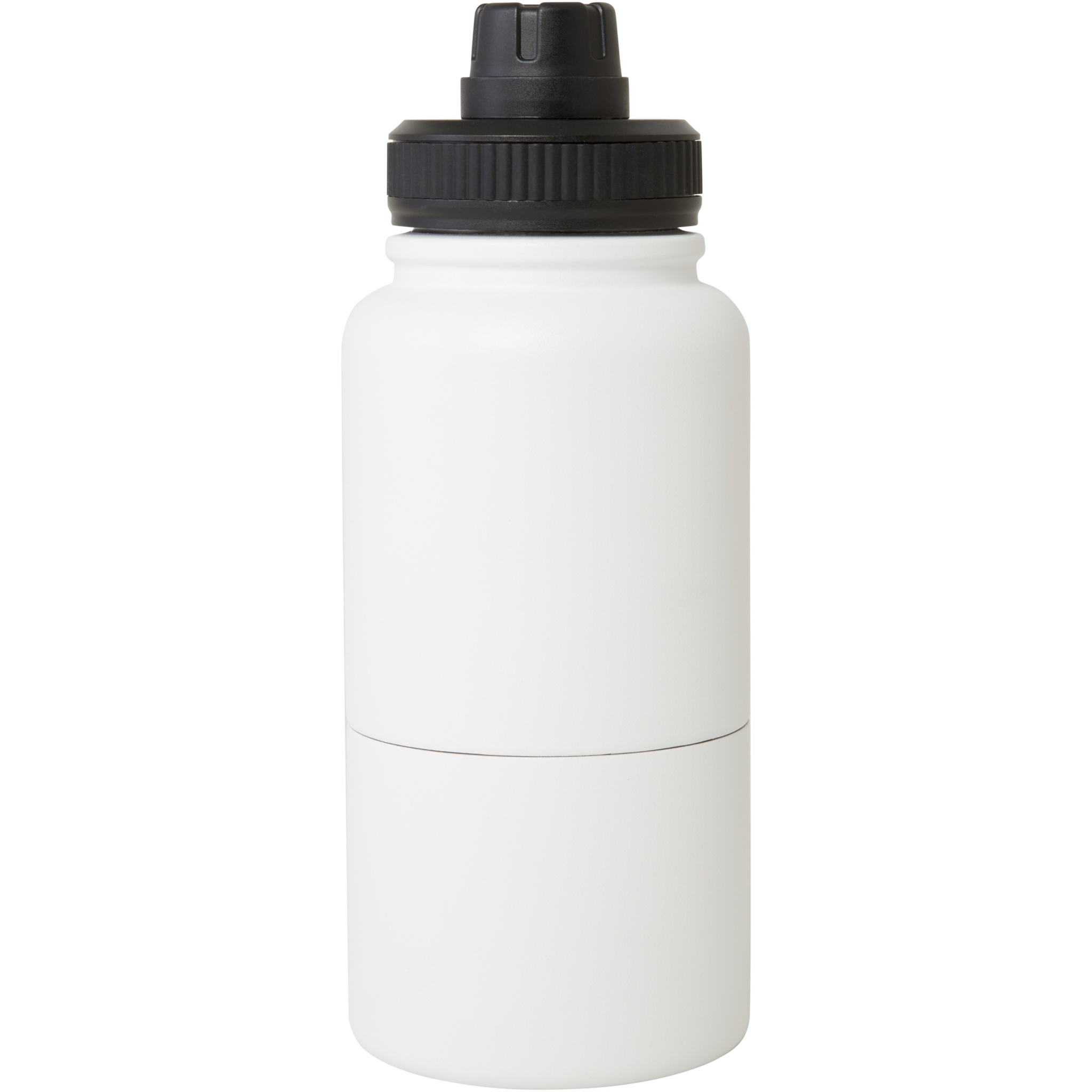 Многоразовая бутылка-термос из нержавеющей стали, сертифицированная RCS, со съемным контейнером для хранения. В верхней части бутылка имеет медный изолированный термос объемом 530 мл, который сохраняет напитки горячими или холодными в течение нескольких часов. Нижняя часть представляет собой контейнер с двойными стенками, вмещающий до 340 мл. Его можно использовать как чашку для любимых холодных напитков или для хранения закусок или других мелочей. Поставляется в подарочной коробке из переработанного картона.
