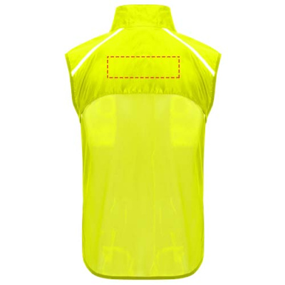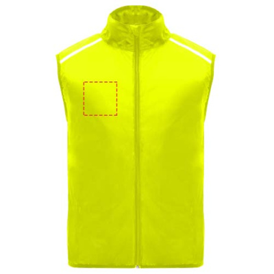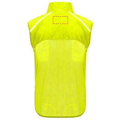 Ветрозащитный и дышащий. Передняя молния с защитой подбородка в тон. Эластичная окантовка в пройме и по низу. Нижняя часть спины из ткани с микроперфорацией. Яркие детали сверху, спереди и сзади. Карман с эластичным ремешком, позволяющий сложить жилет и носить его на запястье. Съемная этикетка.