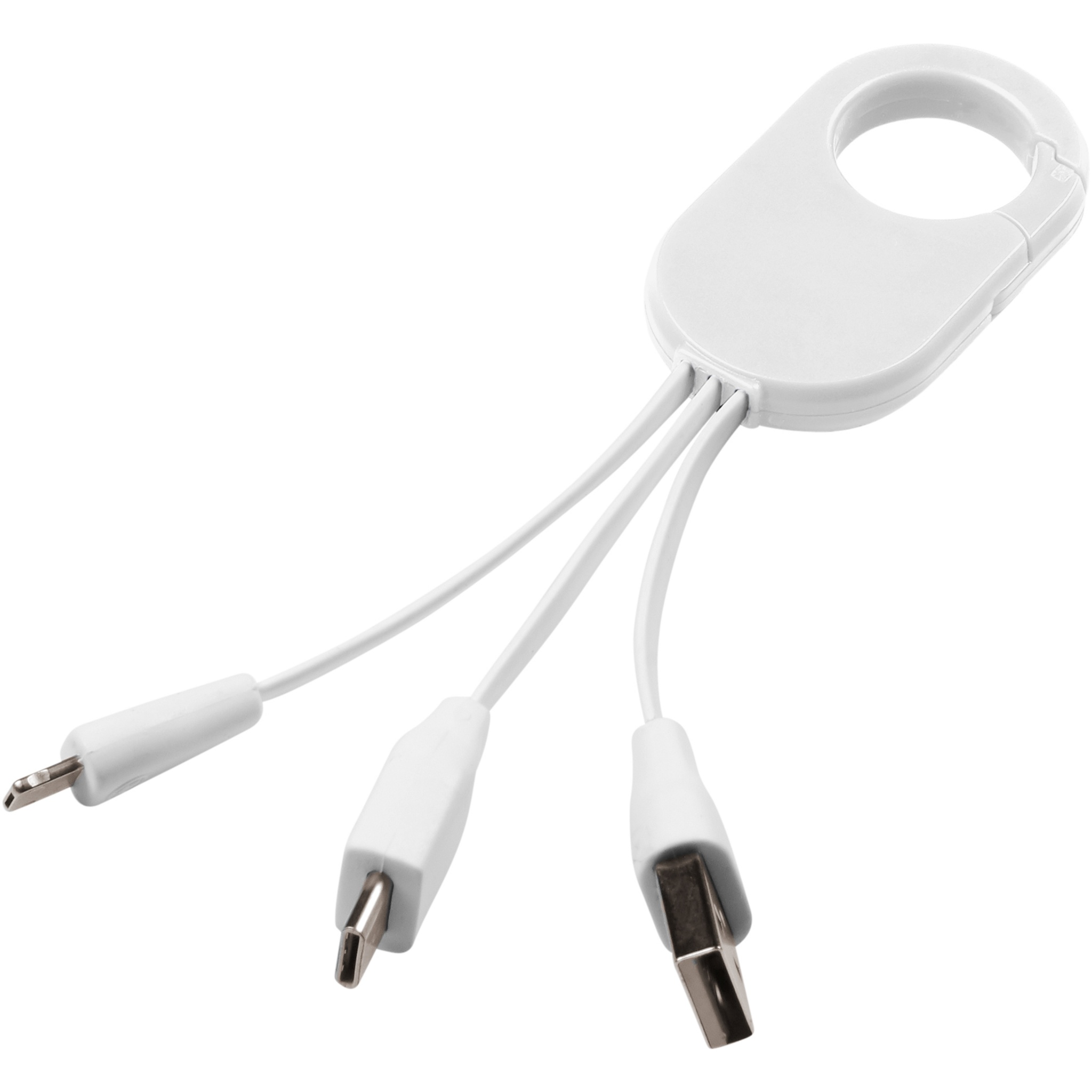 Кабель для зарядки Troop «3-в-1» с коннектором USB Type C и двойным совместимым коннектором «2-в-1» для устройств Apple® iOS и Android. Кабель оснащен карабином для удобного крепления к сумке.
