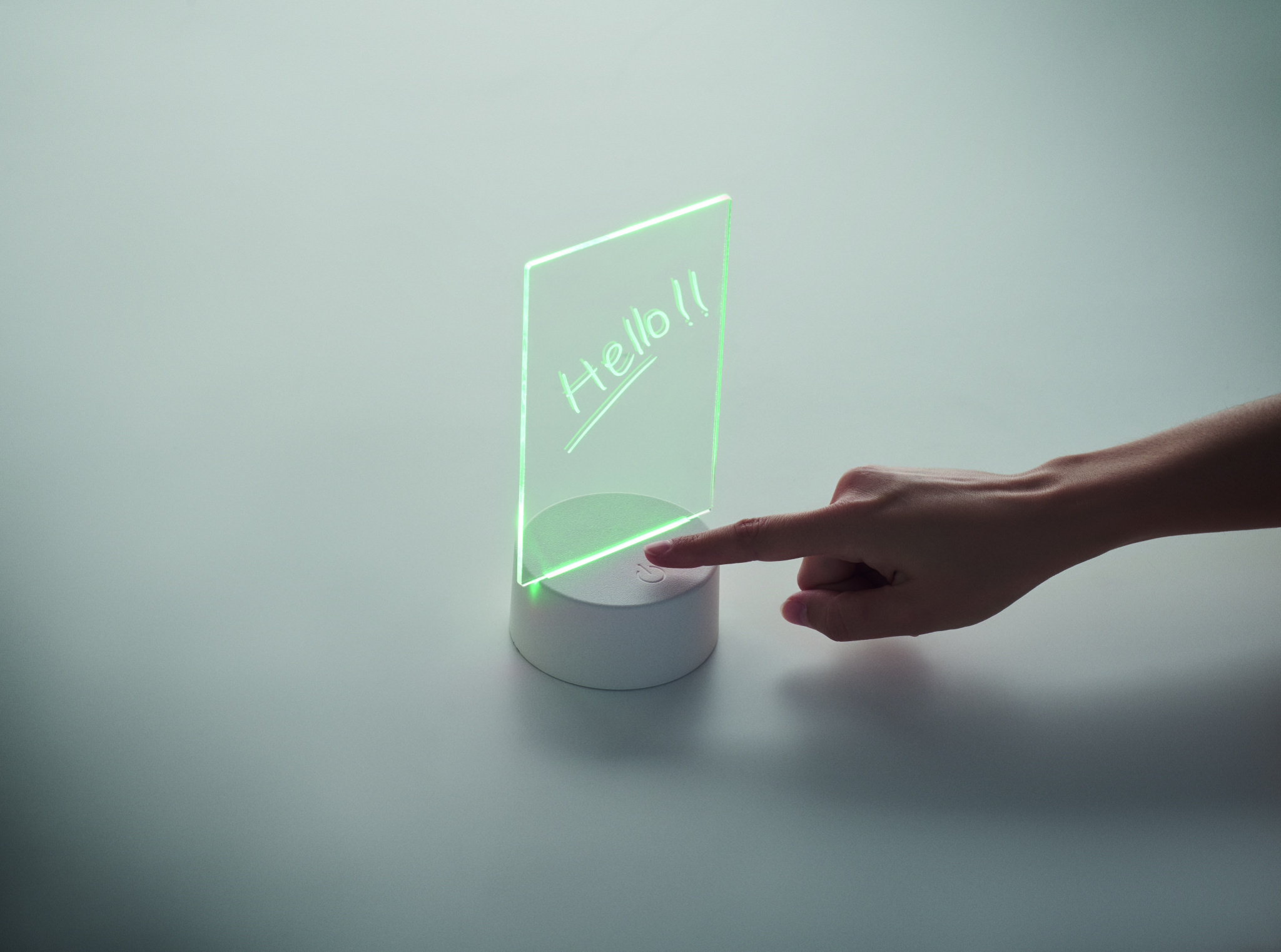 Light-up LED memo board with colour changing light and erasable white marker. Features acrylic board and aluminium base. Battery powered, requires 3 x AAA batteries (not included).