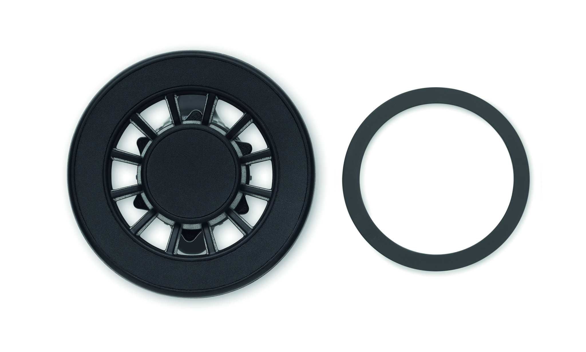 360 degree rotation magnetic air vent mount phone holder in ABS. Includes additional magnetic metal ring to support charging of non-magnetic wireless chargeable phones.