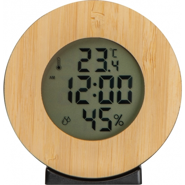 Цифровая метеостанция с бамбуковым элементом. Помимо часов (12/24 ч) она оснащена функцией будильника, термометром (°C/°F), гигрометром и дисплеем даты. Ваш логотип будет выгравирован на бамбуковом кольце. За исключением одной батарейки AAA; заказывайте ее отдельно (Артикул № 999400).