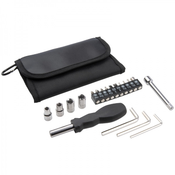 Набор инструментов состоит из отвертки с различными гайками и битами, удлинителя и трех шестигранных ключей разных размеров, а также практичной сумки с карабинами, на которых мы печатаем ваш логотип. Набор индивидуально упакован в полиэтиленовый пакет.