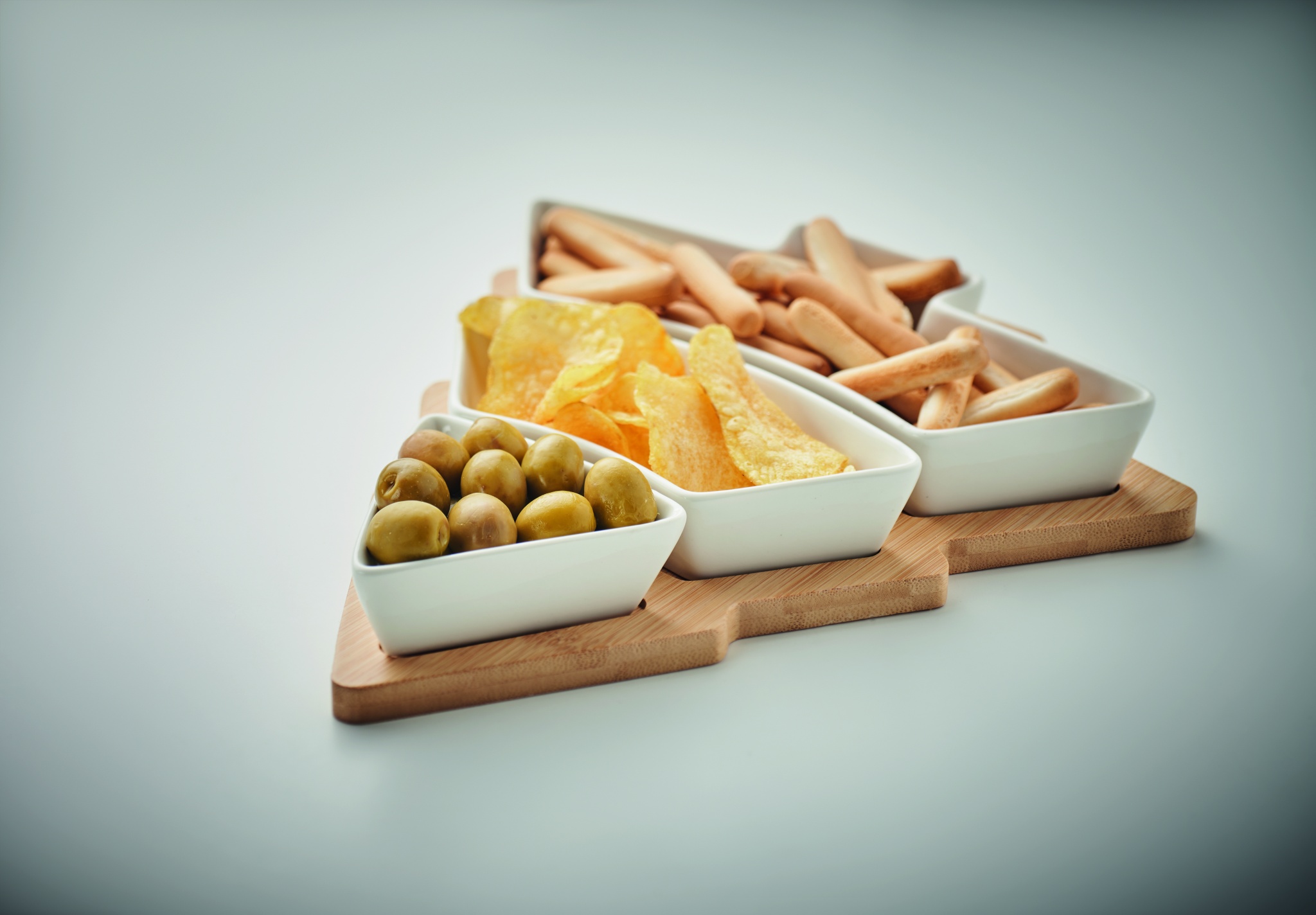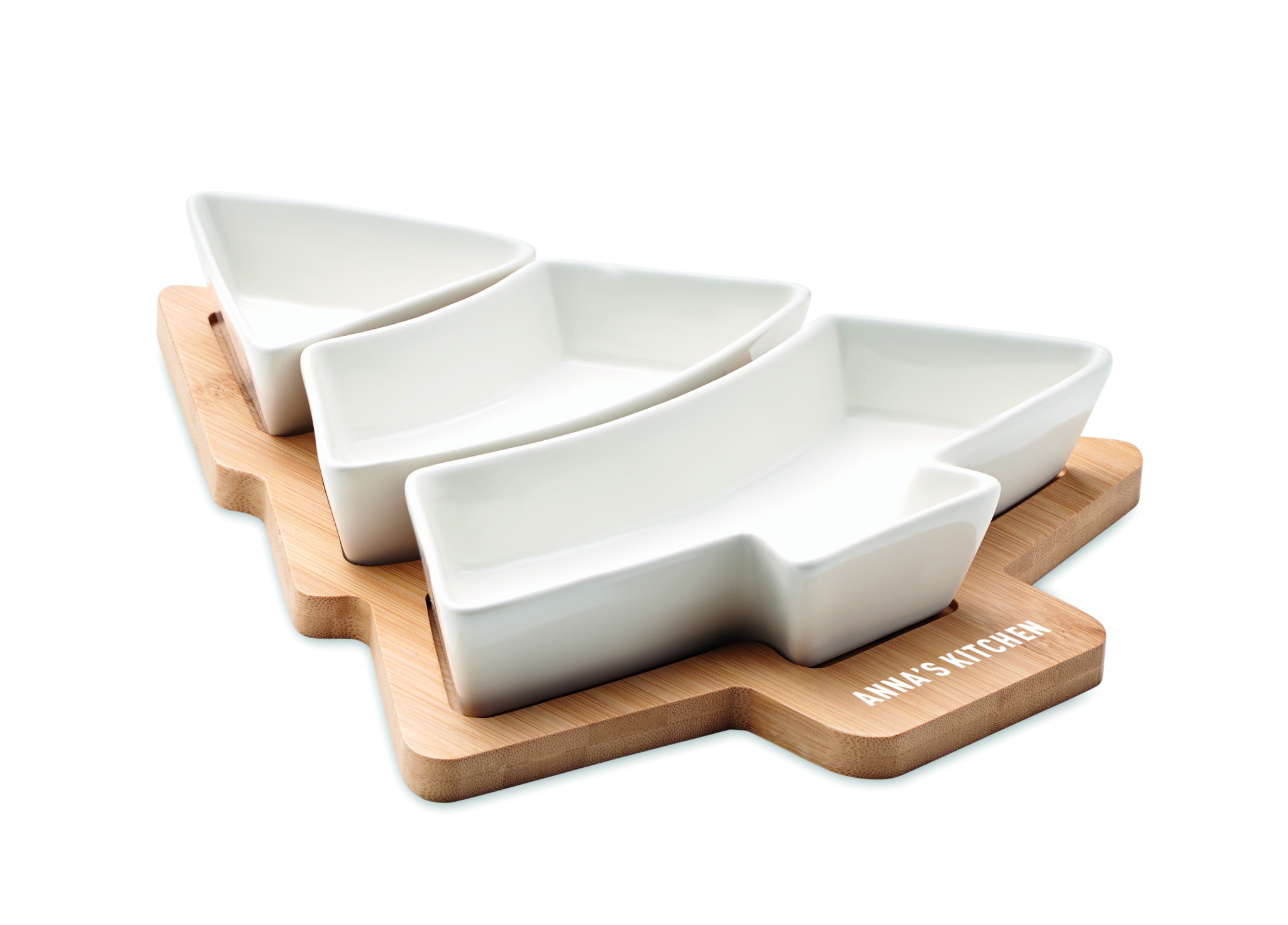 Бамбуковая сервировочная доска в форме дерева с тремя керамическими тарелками в комплекте.