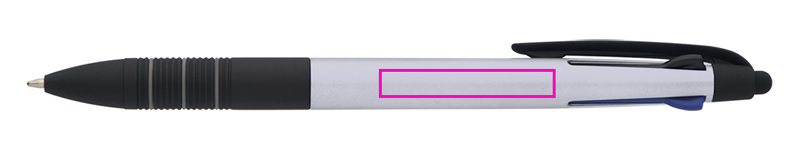Пластиковая шариковая ручка 4 в 1 с 3 разными цветами письма (синий, красный и черный) + сенсорная функция и прорезиненная зона захвата. Мы напечатаем ваш логотип на стержне.