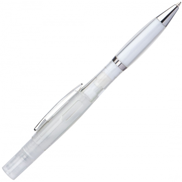 Прозрачная ручка Twistpen с серебряными аппликациями и синим стержнем. Распылитель можно заправлять — идеально подходит для парфюмерии или дезинфицирующих жидкостей. Мы напечатаем ваш логотип на правой стороне зажима.