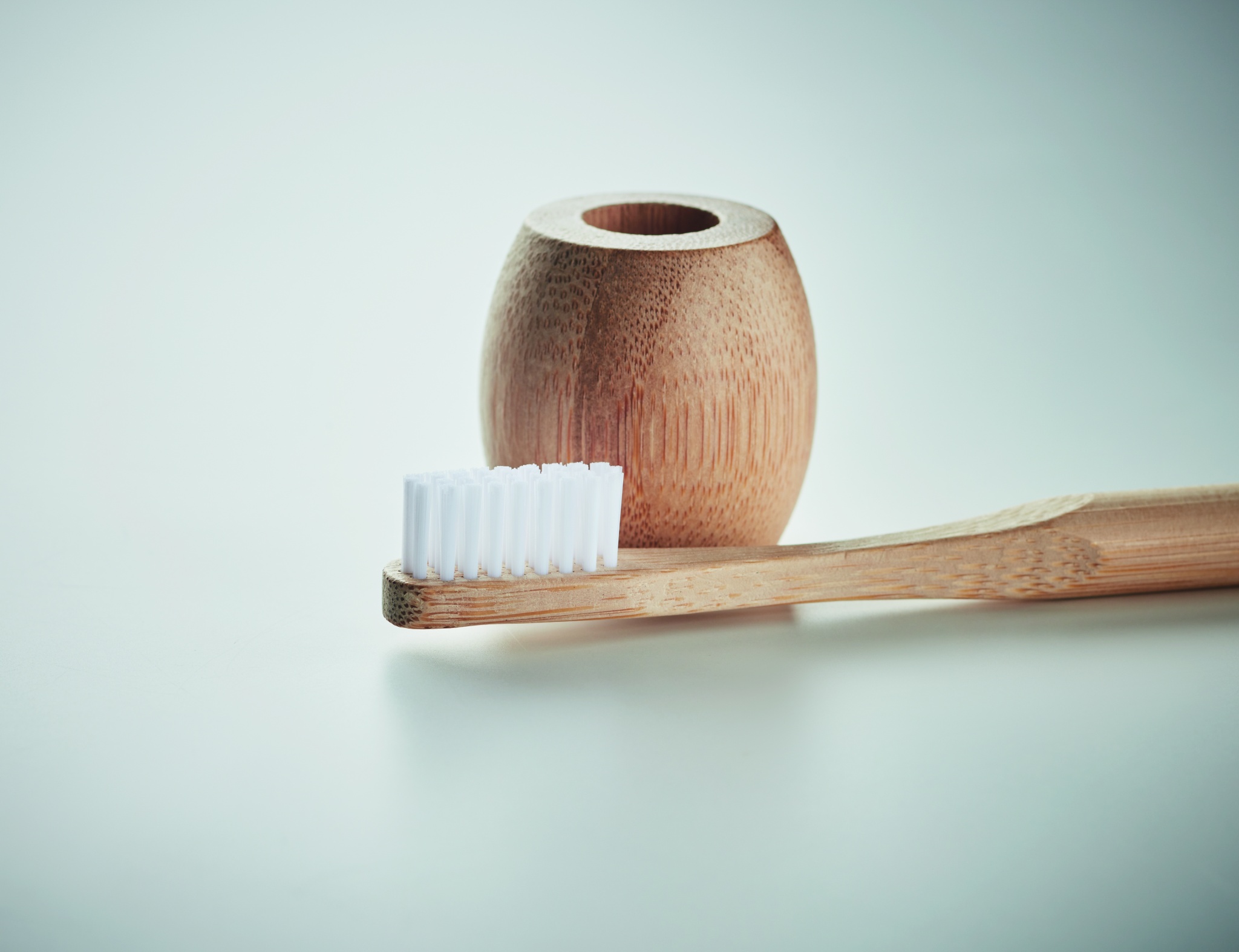 Зубная щетка с бамбуковой ручкой и нейлоновыми щетинками на подставке. Поставляется в коробке из крафт-бумаги.