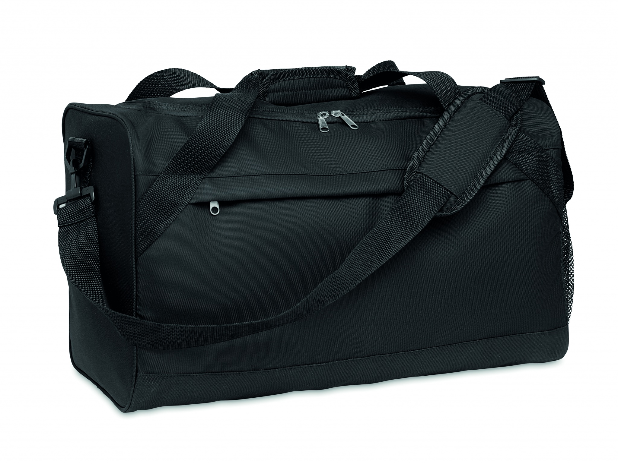 Спортивная или дорожная сумка из 600D RPET с большим фронтальным и внутренним карманом на молнии и регулируемым съемным плечевым ремнем.
