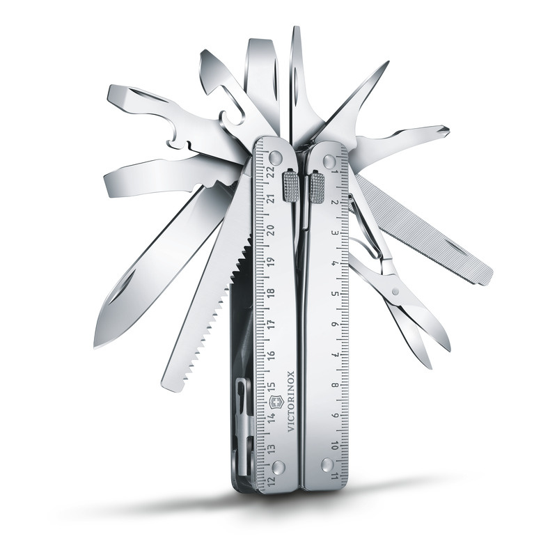 Swiss Tool X — предложение для тех, кто ищет нечто большее, чем карманный нож. Это целый набор инструментов, помещенный в один элегантный корпус с продуманным дизайном. Инструмент поставляется с кожаным чехлом. Характеристики: 1. шампур 2. плоскогубцы 3. отвертка 2 мм 4. отвертка 3 мм 5. кусачки 6. отвертка 5 мм 7. открывалка для бутылок 8. отвертка 7,5 мм 9. лезвие 10. ножницы 11. напильник по металлу 12. ножовка по металлу 13. пила по дереву 14. отвертка 1-2 звезды 15. стамеска 16. открывалка для ящиков 17. устройство для сгибания проволоки 18. инструмент для снятия изоляции 19. кусачки 20. консервный нож 21. мерный стакан (23 см) 22. измерительная лента (9 дюймов) 23. обжимка электрического кабеля 24. кожаный чехол с петлей для ремня 25. закаленные кусачки 26. монтажная проушина 27. 12 отдельных пружин 28. разблокировка замка 29. контейнер для розеток 30. розетка ключ - в комплекте головки: 31. малый торцевой ключ - в комплекте головки: 32. - Hex 3 33. - Hex 4 34. - Phillips 0 35. - Phillips 3 36. - Torx 10 37. - Torx 15 38. место для дополнительной головки 39. место для дополнительной головки 40. штопор 41. мини-отвертка L2 - гравировка на лезвии L3 - гравировка на крышке