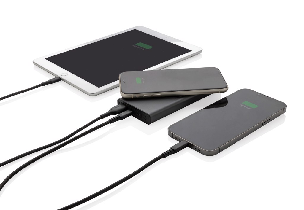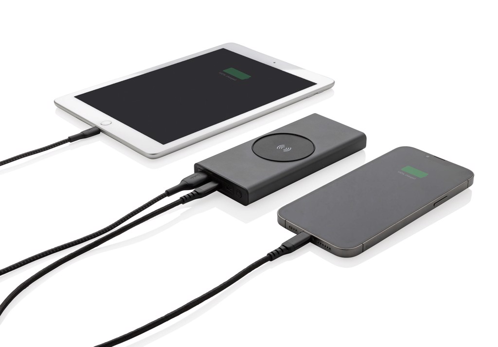 Сверхбыстрый зарядный аккумулятор, изготовленный из сертифицированного RCS (Recycled Claim Standard) переработанного алюминия и АБС. Общее содержание переработанного материала: 28% от общего веса изделия. Сертификация RCS гарантирует полностью сертифицированную цепочку поставок переработанных материалов. Алюминий не теряет своих характеристик в процессе переработки и может перерабатываться бесконечно. В аккумулятор встроен долговечный литий-полимерный аккумулятор класса А емкостью 10 000 мАч. Выходной порт C поддерживает быструю зарядку до 18 Вт, а также быструю повторную зарядку в течение 3 часов. Беспроводное зарядное устройство поддерживает беспроводную зарядку до 10 Вт. Индикаторы питания покажут оставшийся уровень энергии, поэтому вы всегда будете знать, когда следует подзарядить. Изделие и аксессуары на 100% не содержат ПВХ. В комплект входит зарядный кабель типа C из сертифицированного RCS переработанного алюминия, ТПЭ и ПЭТ. Упаковано в упаковку FSC® mix. Выход USB 5/3A, 9V/2A. 12V/1.5A. Выход типа C: 5 В/3 А, 9 В/2 А, 12 В/1,5 А. Вход типа C: 5 В/3 А, 9 В/2 А, 12 В/1,5 А. Вход Micro USB: 5 В/2 А, 9 В/2 А, 12 В/1,5 А.