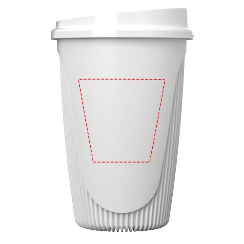 Muggen Alto på 350 ml är ett sofistikerat och elegant dricksglas med enkelvägg och isolerande kanter för säker och bekväm hantering. Den har ett elegant fästlock med en diskret upphöjning, något som skapar en taktil metod för att lokalisera drickpipen. Både locket och kärlet är tillverkade av helt återvinningsbar plast. Njut av dina varma favoritdrycker med både komfort och stil.