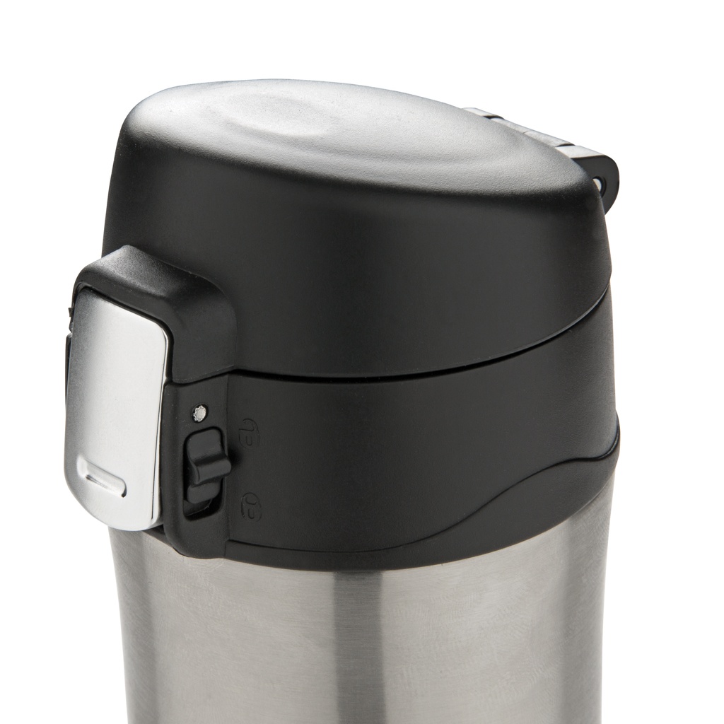Dubbelväggig termos i rostfritt stål som håller din dryck varm upp till 5 timmar eller kyld upp till 15 timmar. Locket går att låsa och på så sätt undviker du spill och läckage. Locket är enkelt att rengöra för optimal hygien och kan till och med diskas i maskin. Termosens unika design gör det möjligt att dricka smidigt och säkert med en hand direkt från flaskan. Flaskans storlek passar nästan alla bilmugghållare. Kapacitet: 450 ml.