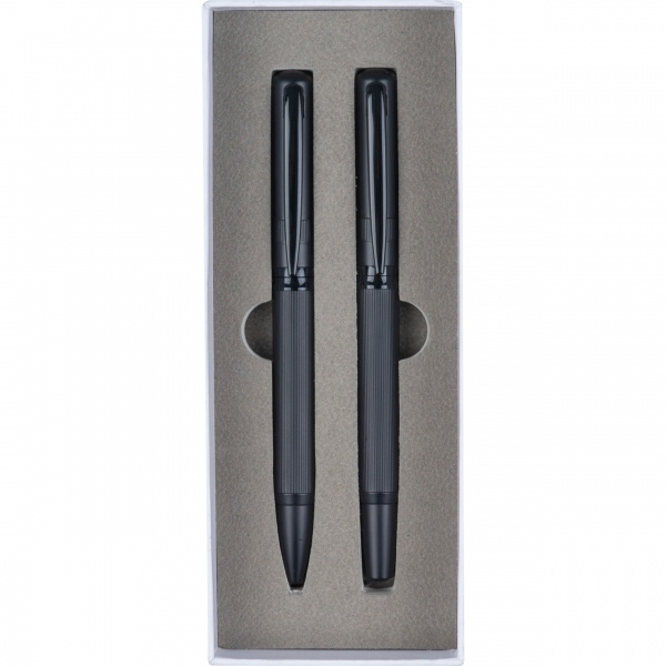 Högkvalitativt skrivset bestående av en rollerball och en vridkulspetspenna, båda med blåskrivande refill i elegant design. Förstärkt med MoLu-logotypen, mattsvart tryckt på den svarta ringen. Perfekt för stilfullt skrivande och en exklusiv present!
