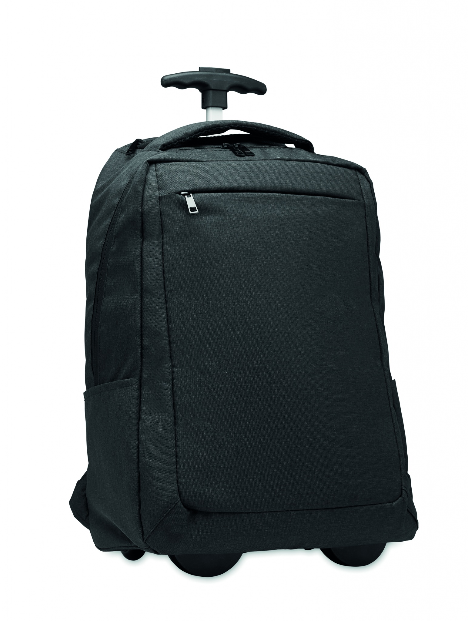 Laptop-ryggsäck med hjul i 600D RPET-polyester. Innehåller ett invändigt 15 tums fack för bärbar dator. Ficka med dragkedja på framsidan. Två sidofickor med dragkedja. Tre innerfickor. Vadderade rygg- och axelremmar. 2 hjul och ram med dubbla rör.