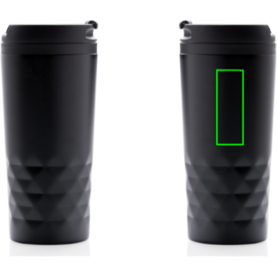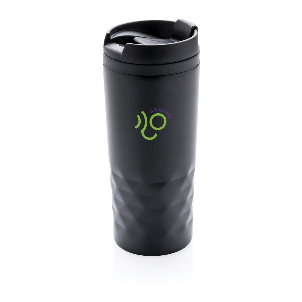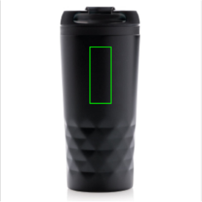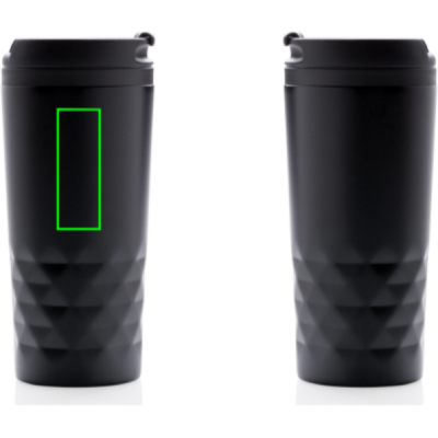 Trendig termosmugg med geometriska detaljer i rostfritt stål. Insida av plast. Endast handdisk. Volym 300 ml.