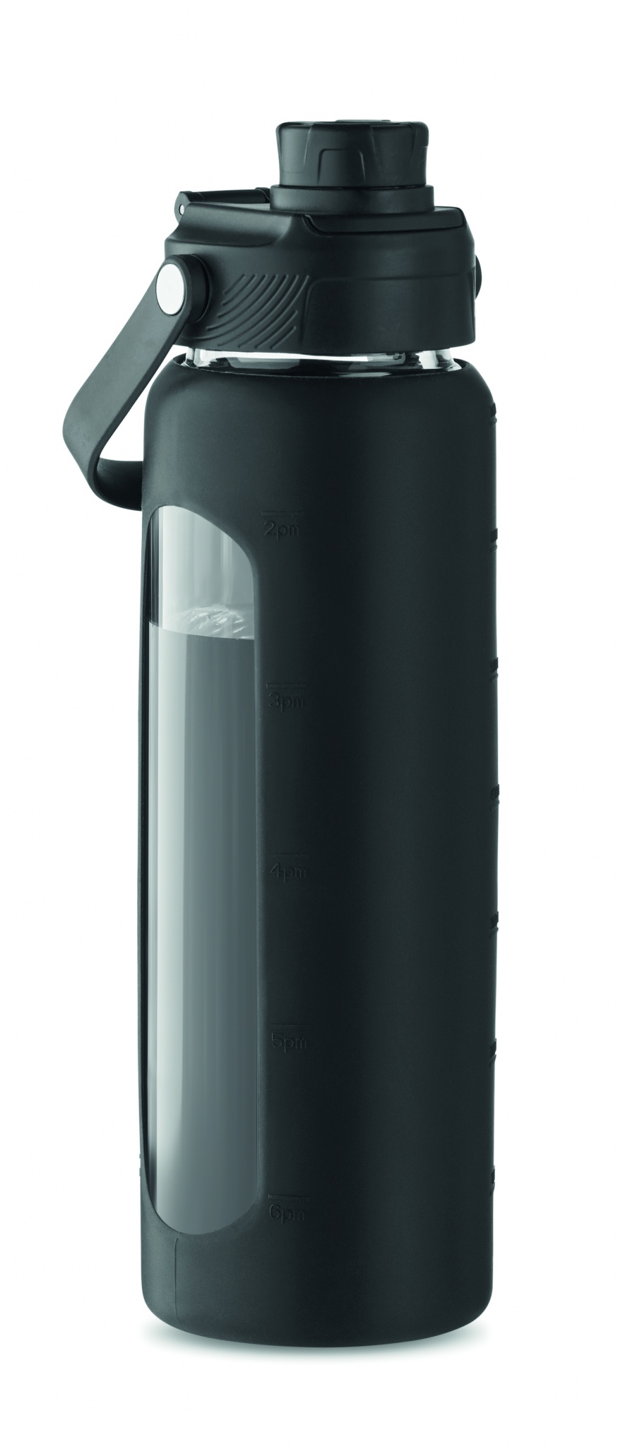 Flaska i borosilikatglas med silikonfodral och PP-lock med bärhandtag. Läcker inte. Volym: 750 ml.