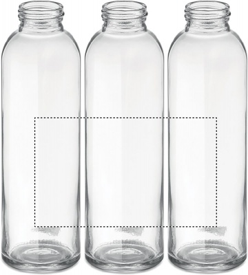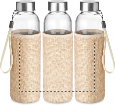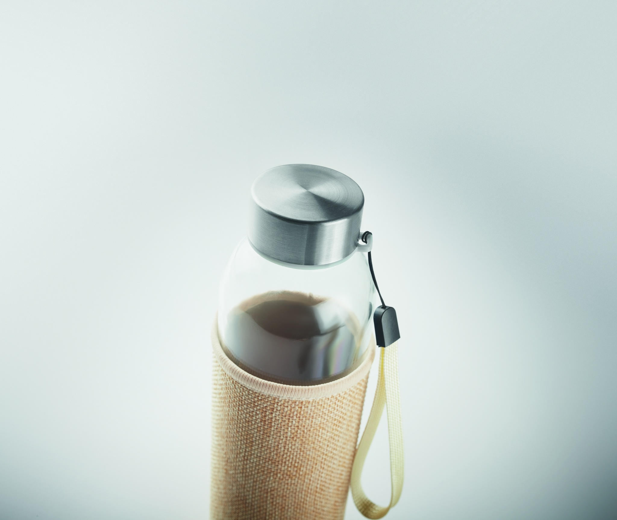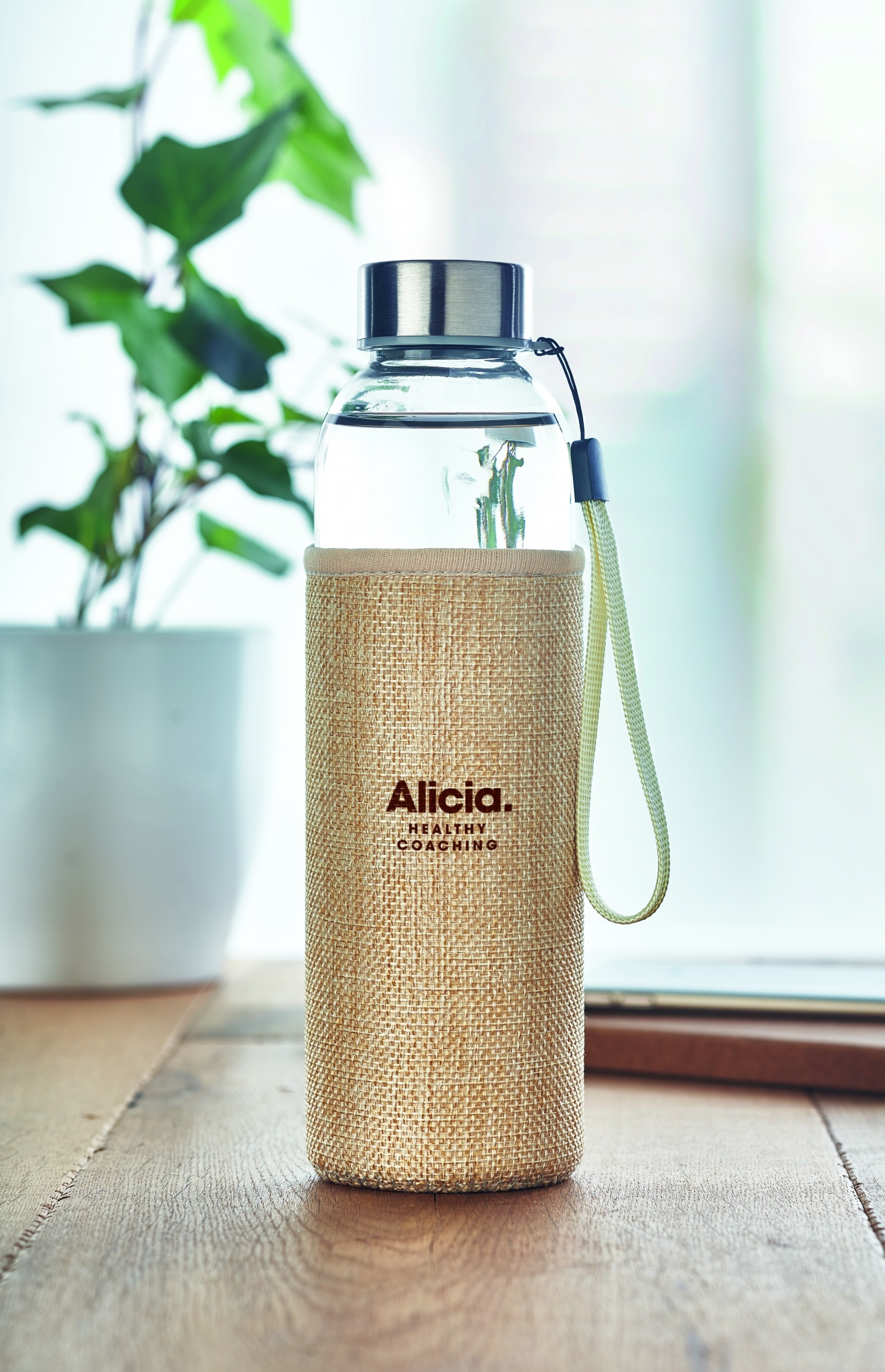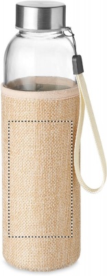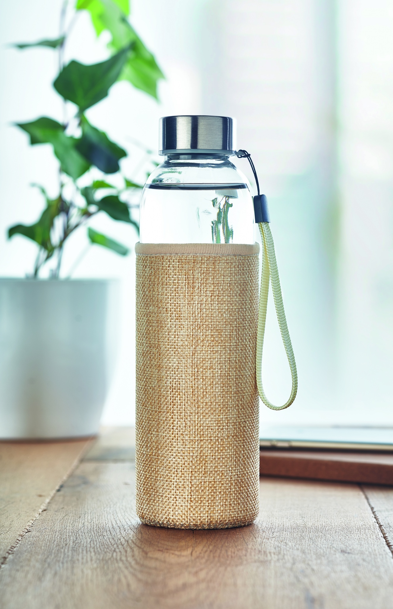 Flaska i glas med fodral av jute/neopren. Capacity: 500 ml. Flaskan klarar maskindisk otryck. Ej lämplig för dryck med kolsyra. Läckagefritt.