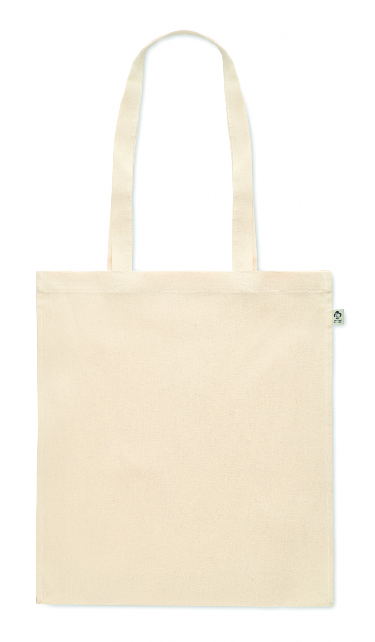 Kasse i ekologisk bomull medbälg och långa handtag. 140 gr/m².