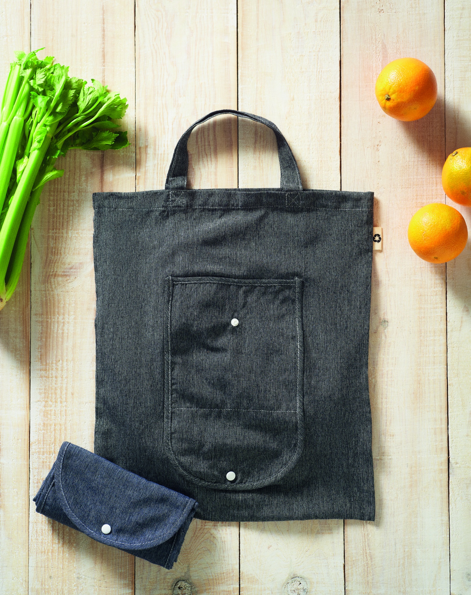 Hopvikbar kasse i 2-färgad återvunnen bomull och återvunnen polyester med långa handtag (20%/80%). Ca 140 gr/m². Den här artikeln kan krympa en aninmg vid tryckning.