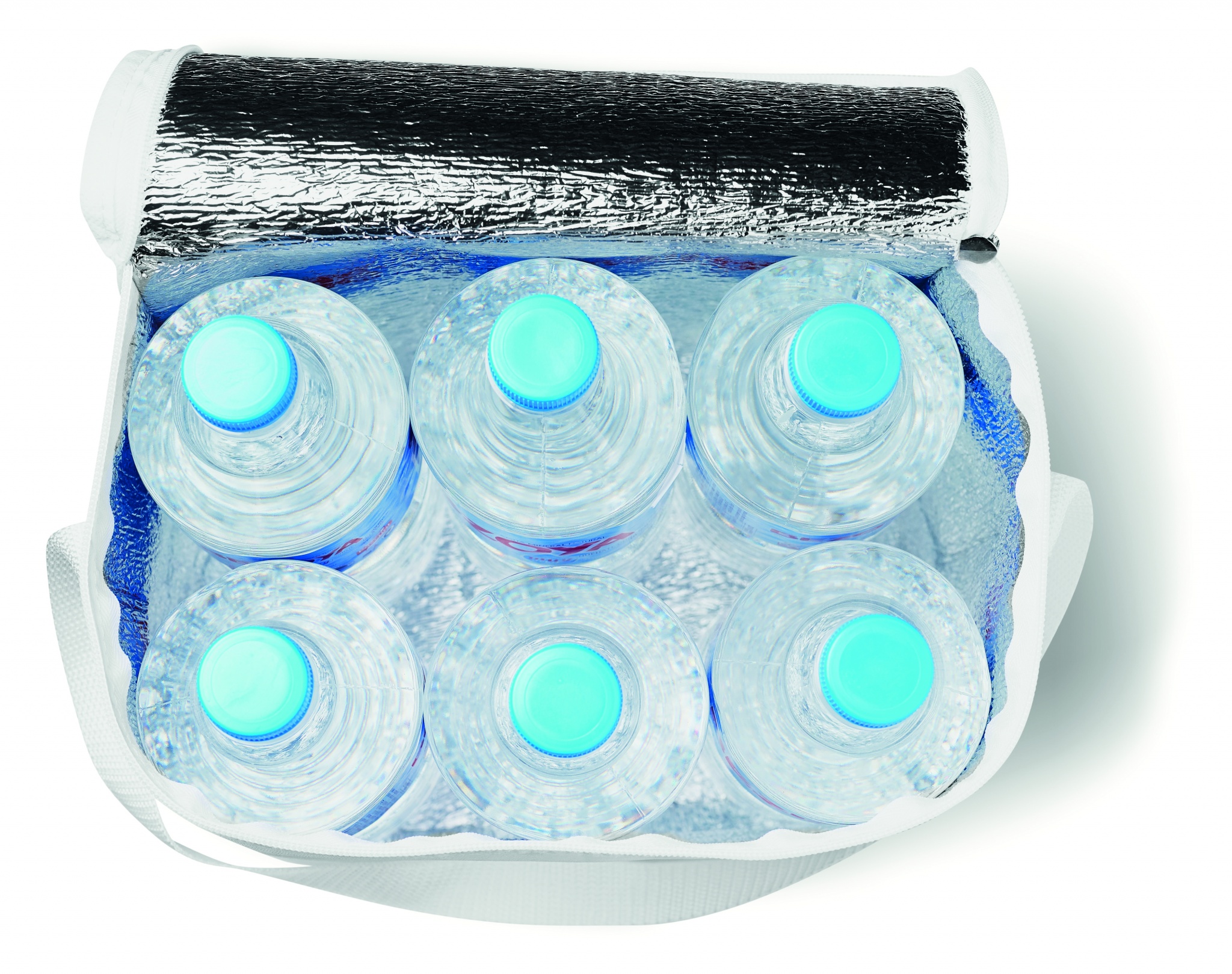 Kylväska, aluminiumfolierad, för 6 st 1,5 liters flaskor. Material 210 polyester. 80 gr/m². Isoleringsmaterial: Aluminium. Volym 13L.