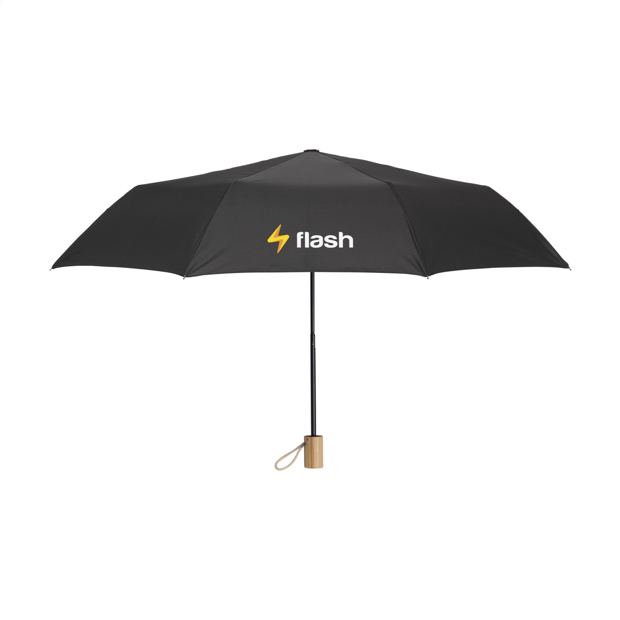 WoW! Vikbart paraply tillverkat av 190T RPET pongee polyester. Med skaft och ram i rostfritt stål, vackert bambugrepp med bomullsögla, kardborrestängning, förvaringsväska och RPET-etikett. Manuell drift. RCS-certifierad. Totalt återvunnet material: 18%.