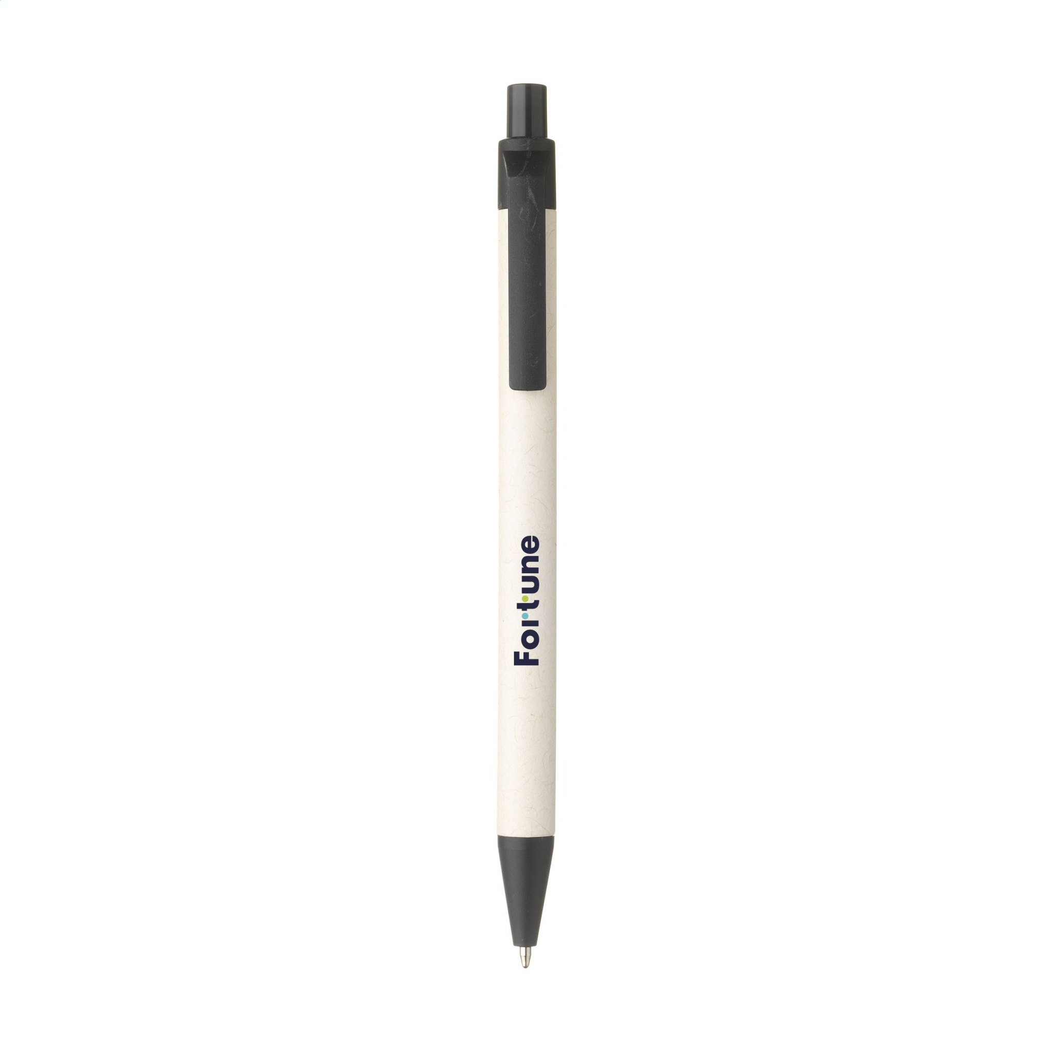 WoW! Kulspetspenna med blått bläck. Pennan på denna penna är gjord av återvunna mjölkkartonger. Klämman, tryckknappen och spetsbiten är gjorda av PLA. PLA är ett biologiskt nedbrytbart material tillverkat av majsstärkelse som produceras av växter - naturligt och förnybart. På grund av användningen av återvunnet material kan små brister i materialet vara synliga. Detta ger produkten ett unikt utseende.