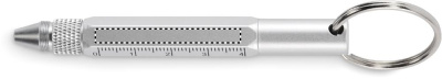 Nyckelring med vridbar penna i återvunnen aluminium med linjal 4 cm och 1,5 tum, stiftpenna och 2 i 1 skruvmejsel med phillips- och platt huvud. Svart bläck.