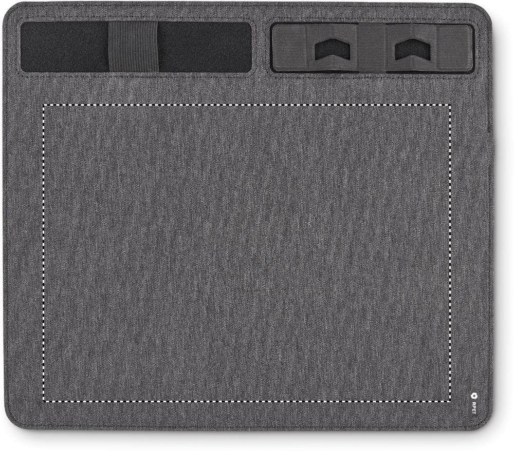 Musmatta med multifunktion. 2-färgad 300D Polyester RPET med 15W trådlös Qi snabbladdare och telefonstativfunktion. Uteffekt: DC 9V/1.6A (15W) för snabbladdning. Kompatibel med senaste Androids, iPhone® 8 och nyare.