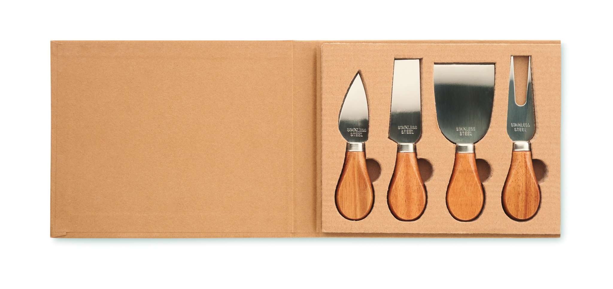 Set med 4 ostknivar i rostfritt stål och handtag i gummiträ. Presenteras i en presentförpackning av wellpappkartong.