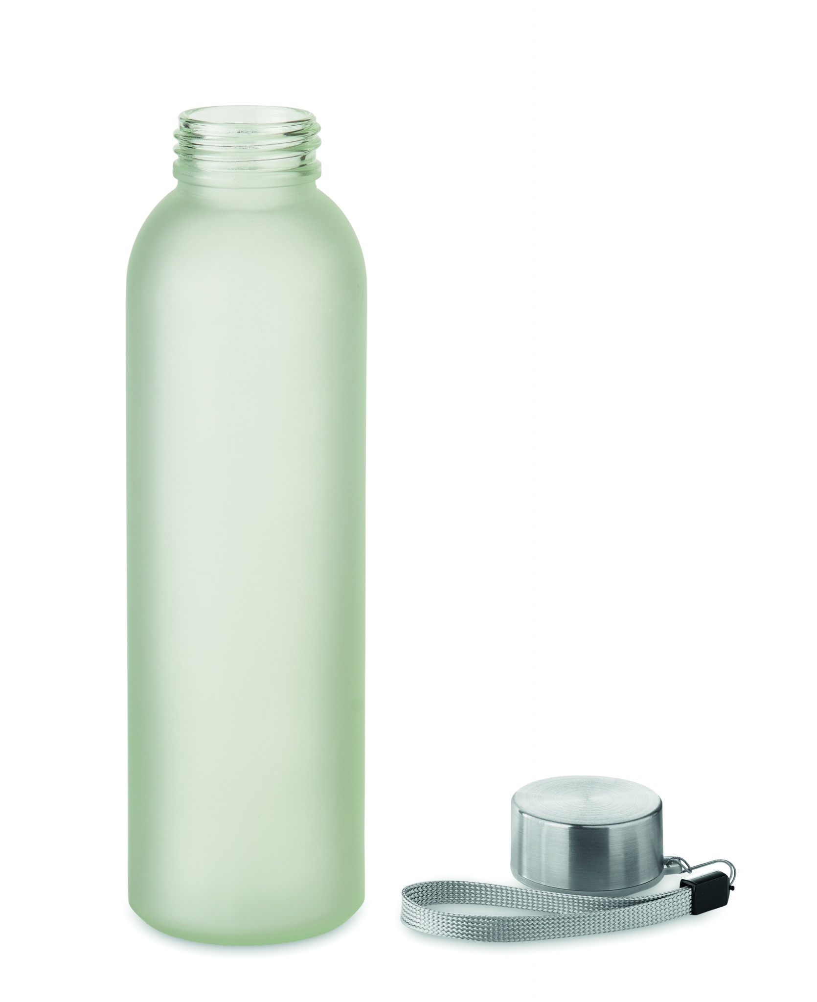 Glasflaska med specialbeläggning för sublimering. Den har ett lock i rostfritt stål och handledsband. Kapacitet: 500 ml.