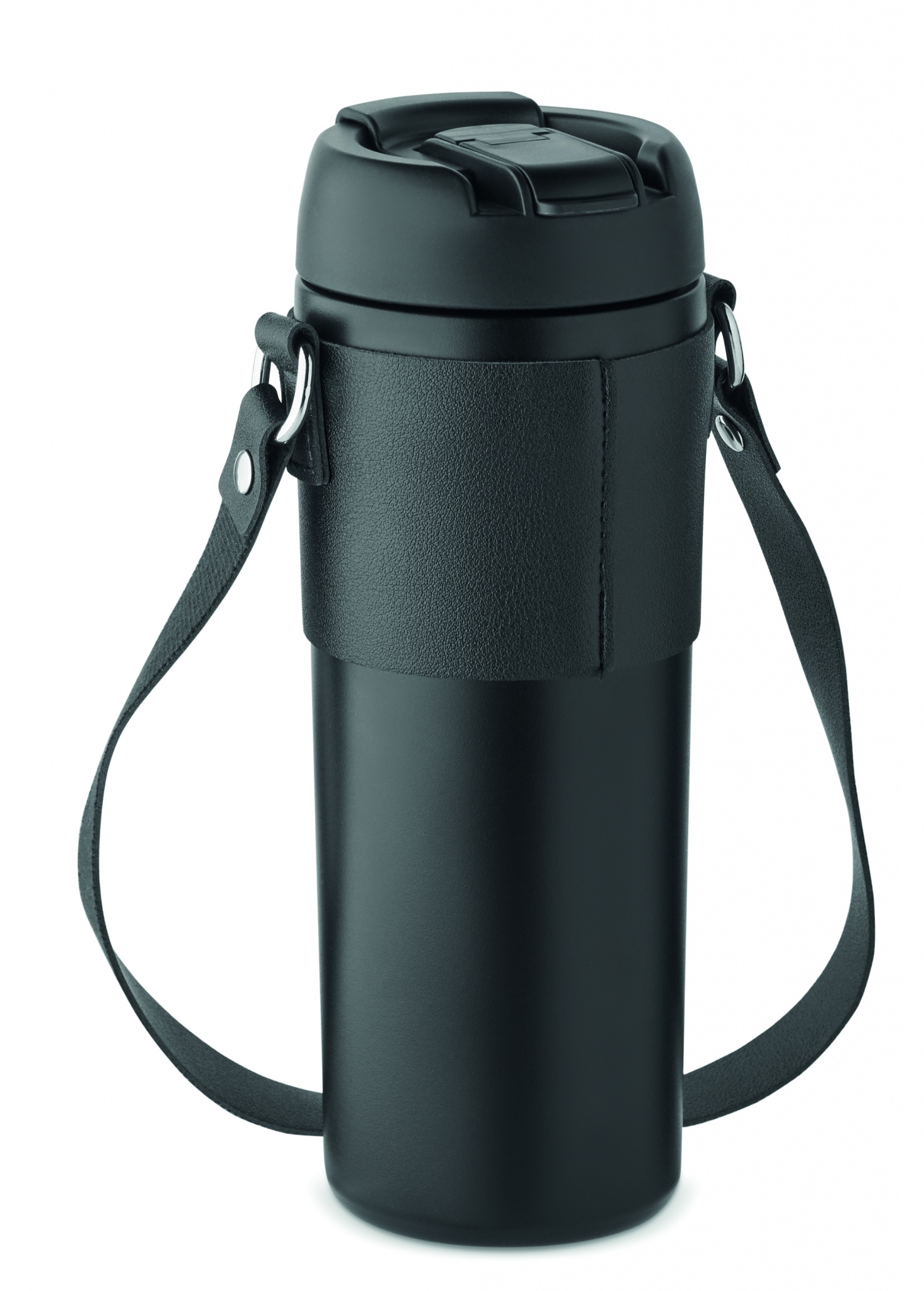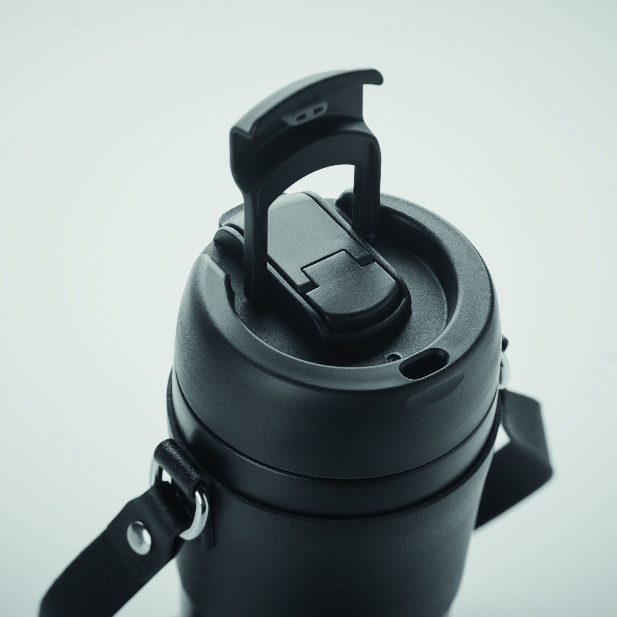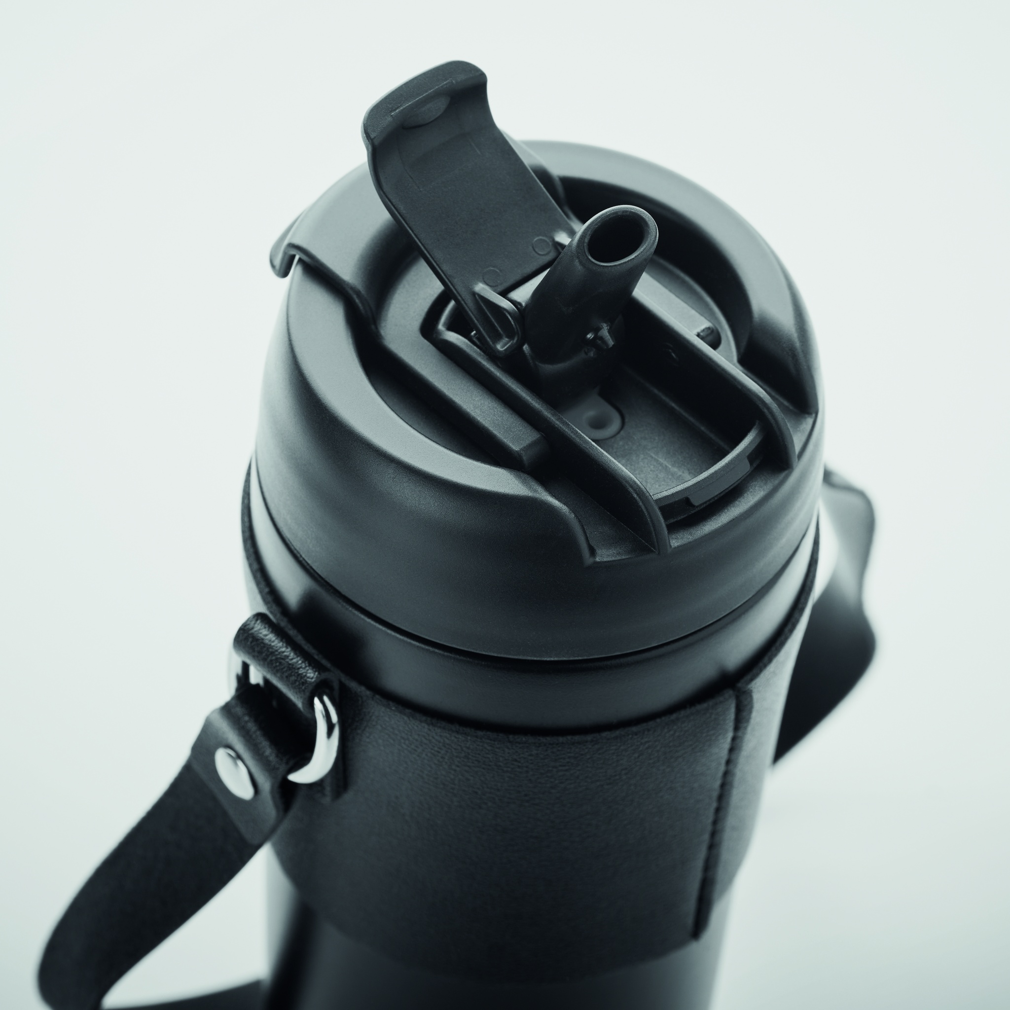 Flaska med dubbelvägg, pulverlackerad i rostfritt stål med PP-lock (2-i-1 sugrörlock) och med PU-bärband. Läcker inte. Volym: 700 ml.