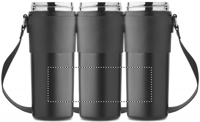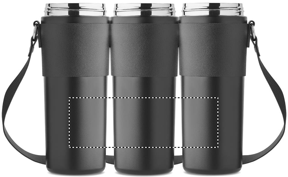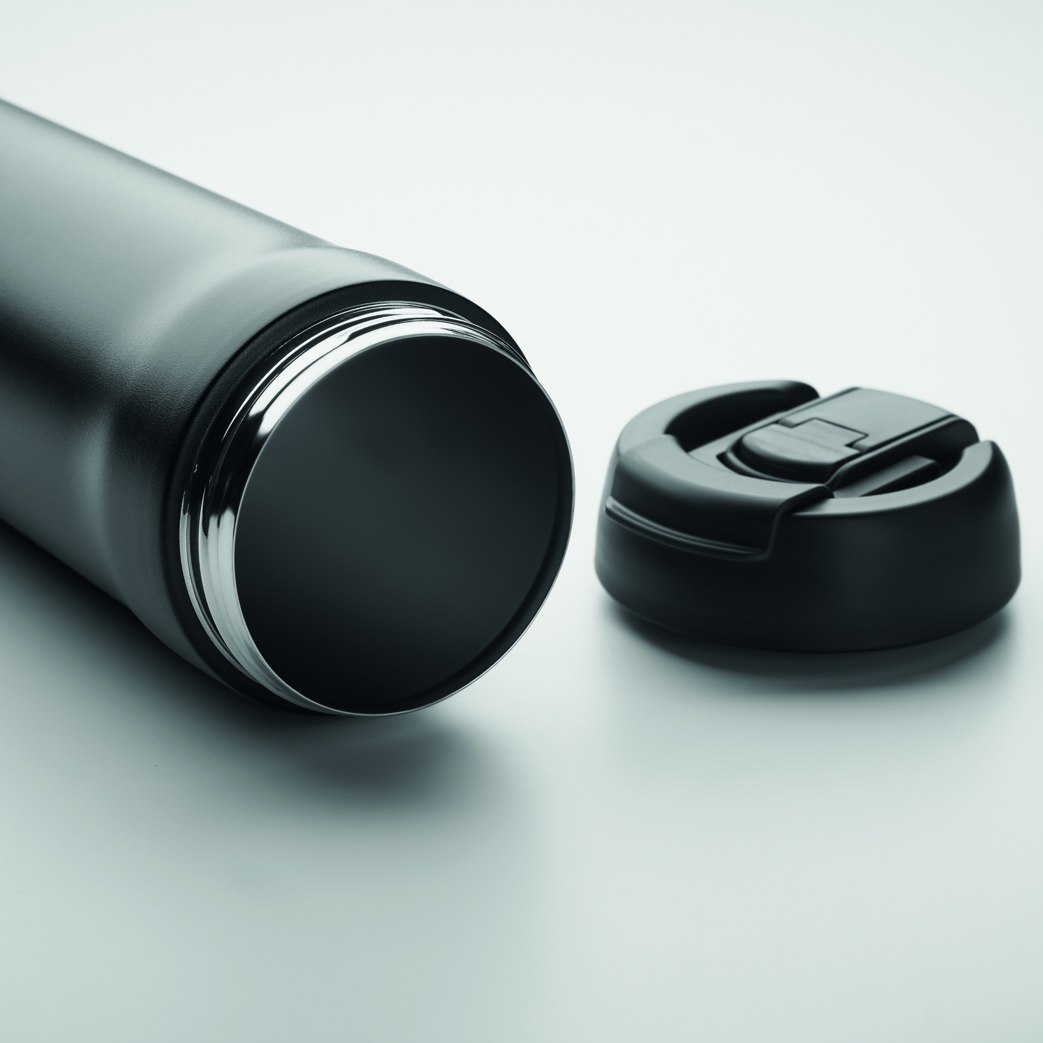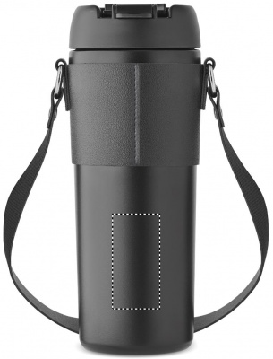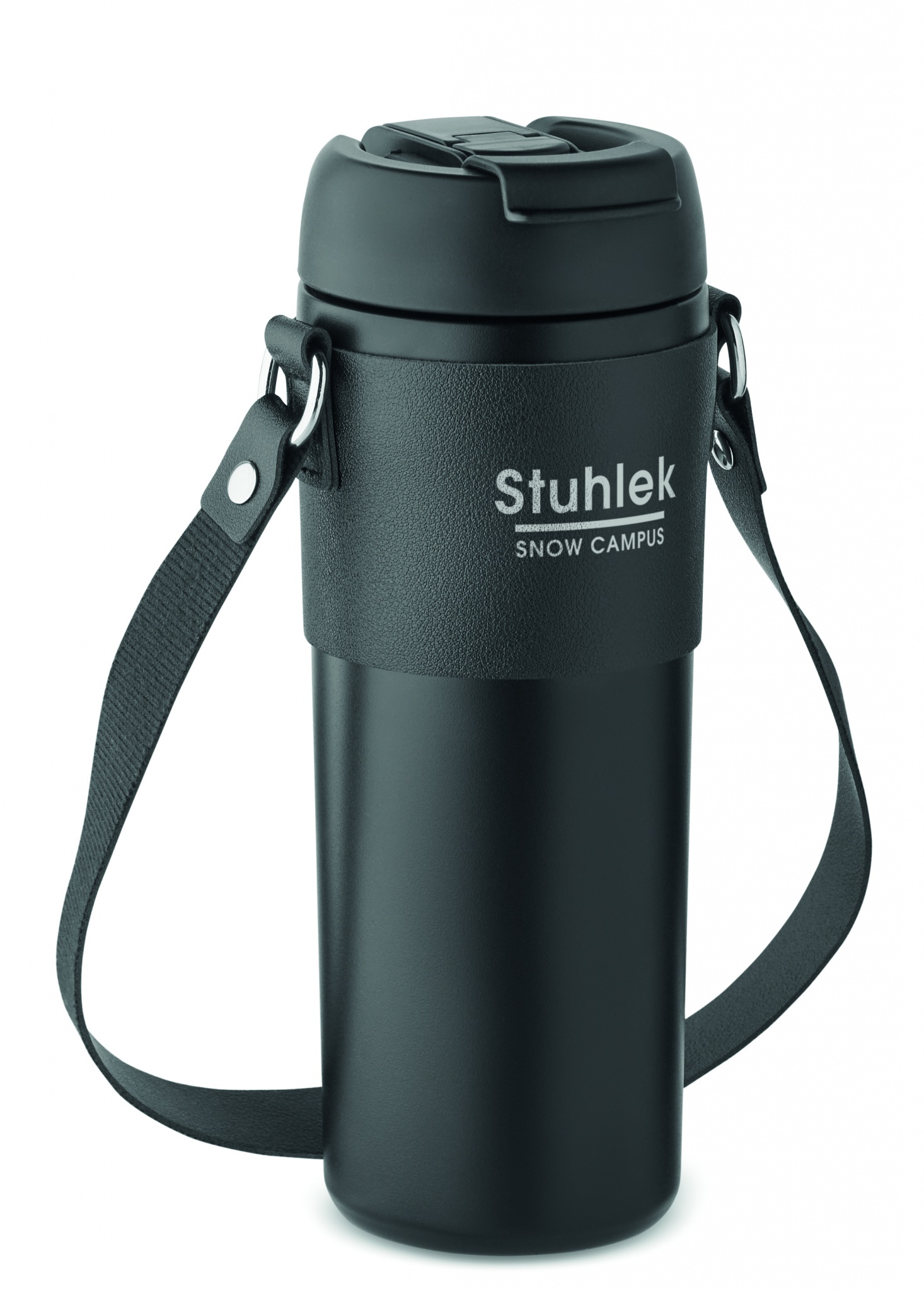 Flaska med dubbelvägg, pulverlackerad i rostfritt stål med PP-lock (2-i-1 sugrörlock) och med PU-bärband. Läcker inte. Volym: 700 ml.
