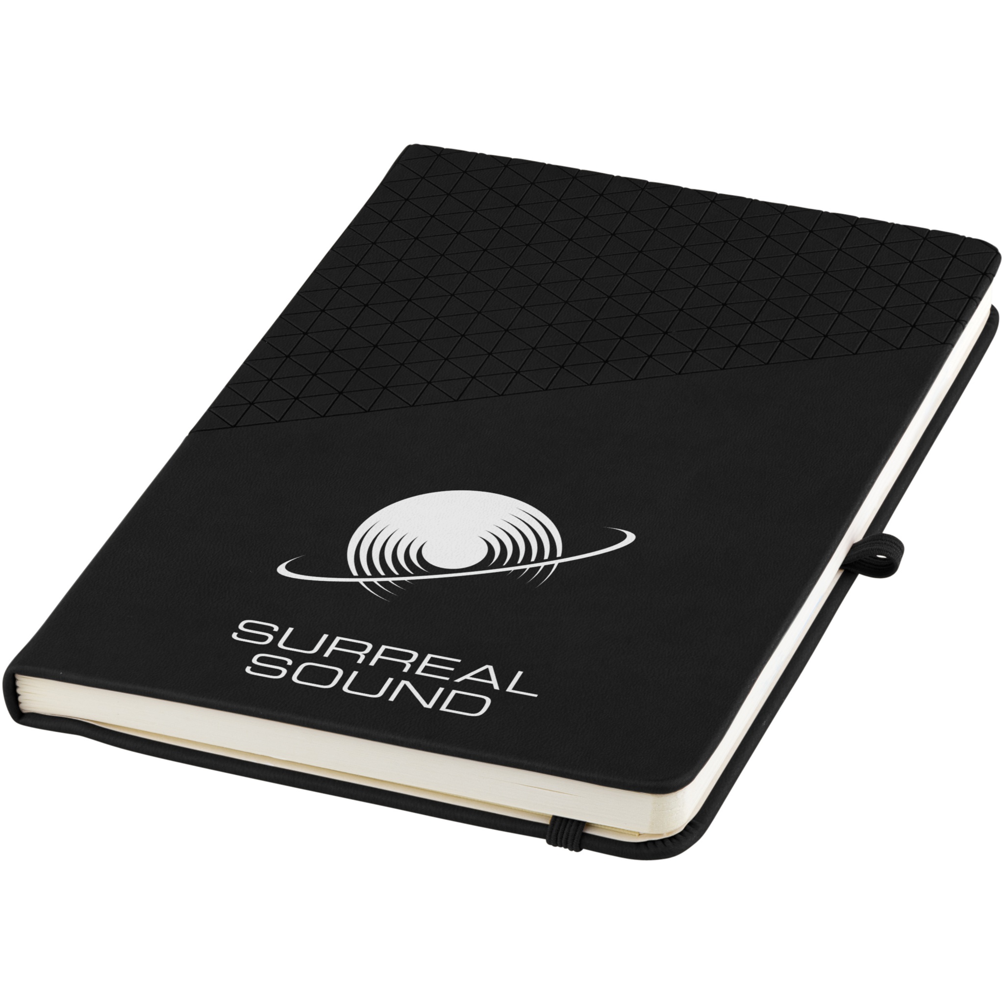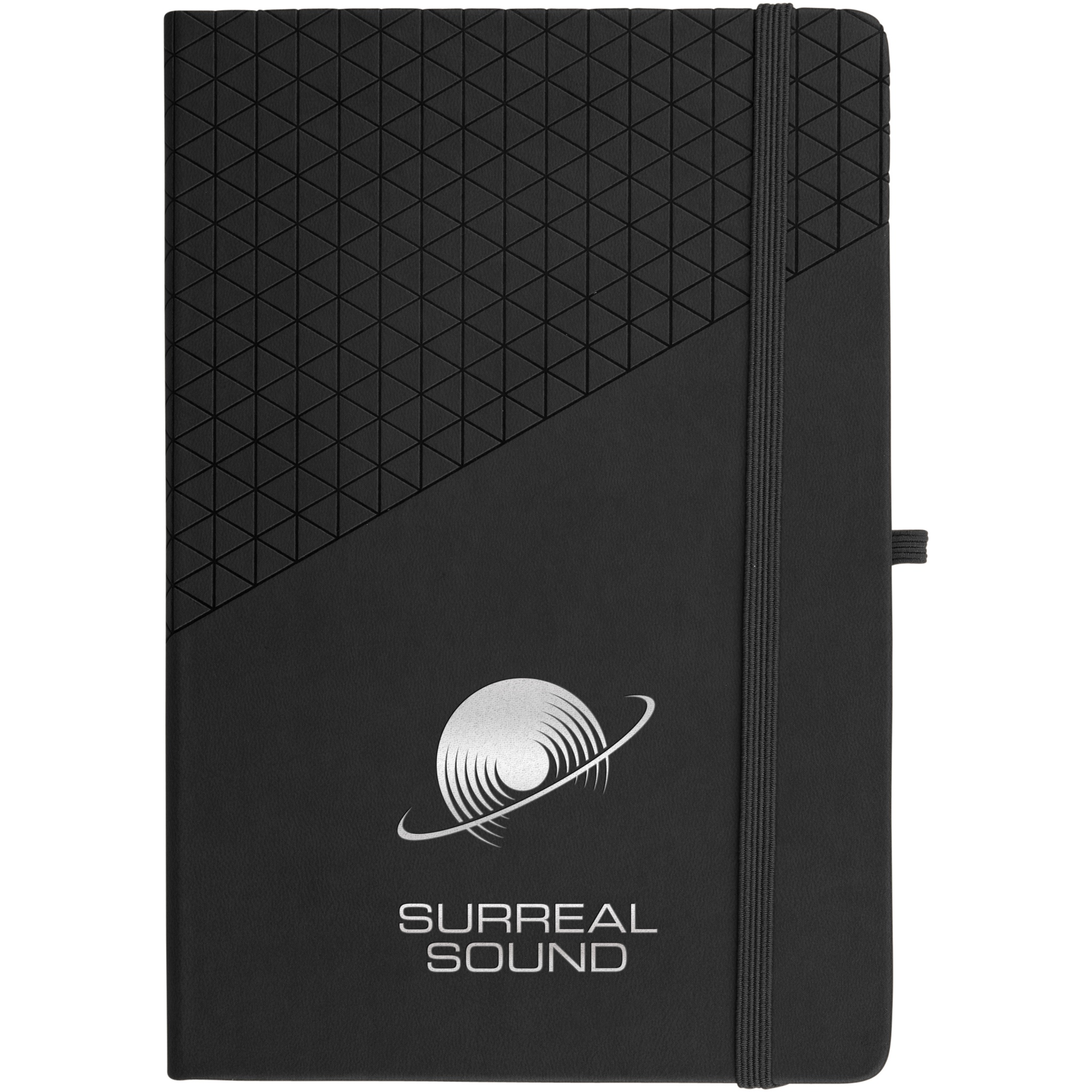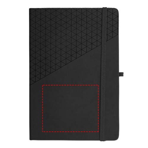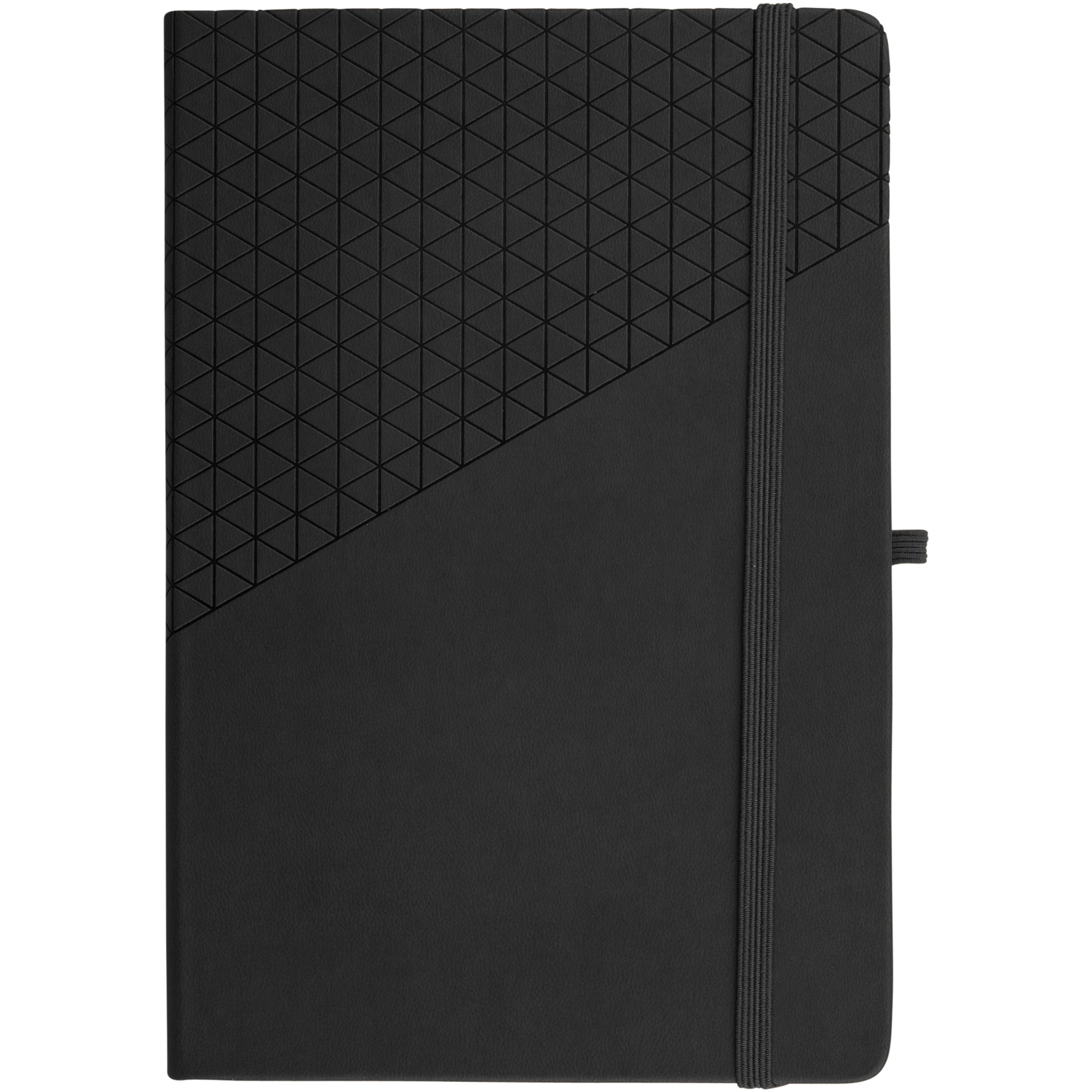 A5 anteckningsbok med soft touch omslag som har geometriskt mönster. Inklusive 80 linjerade blad (80 g/m²), avdelare, resårband och pennögla.