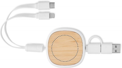 Utdragbar laddningskabel med flera USB-uttag i ABS med bambudetalj på ovansidan. Ingång: 2-i-1 typ-C och typ-A. Utgång: Typ-C och 2-i-1 Typ-B och kontakt. Kabellängd: 90 cm.