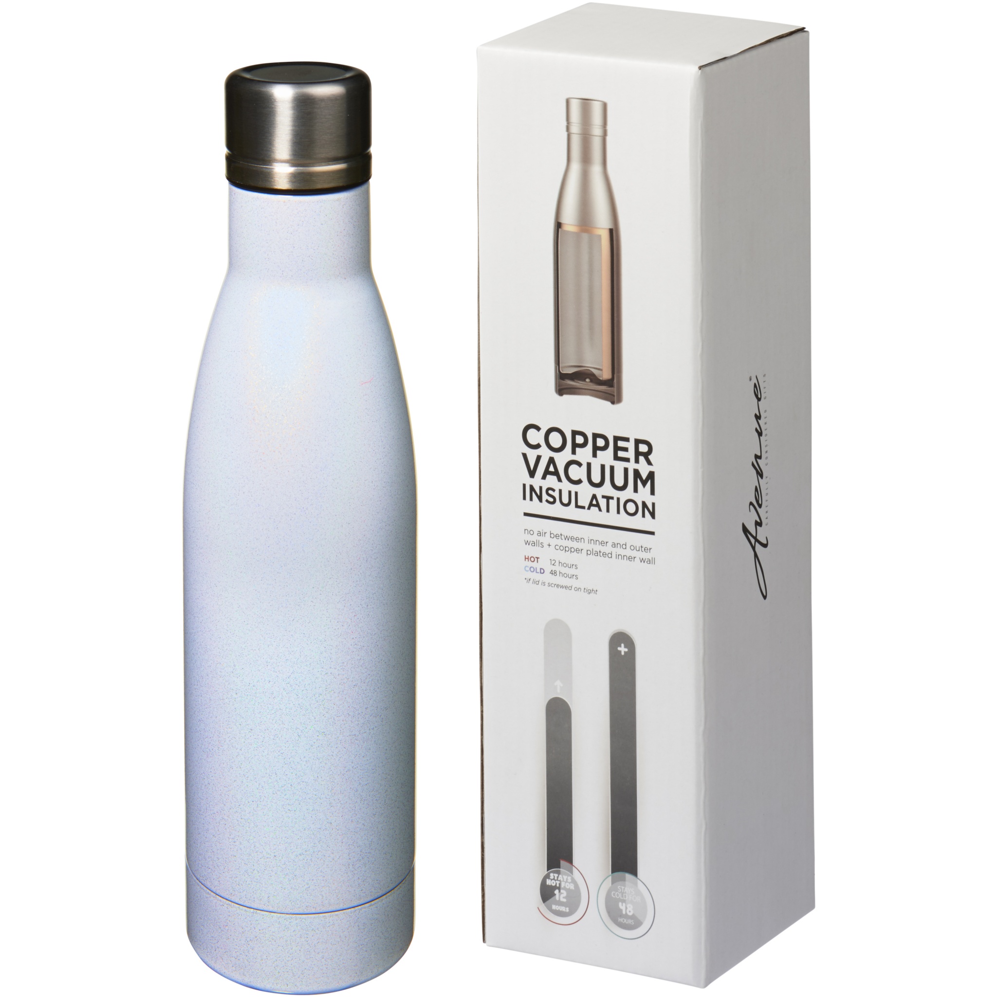 Håll dina drycker varma i 12 timmar eller kalla i 48 timmar med den kopparvakuumisolerade flaskan Vasa Aurora. Flaskan har dubbla väggar och är tillverkad av rostfritt stål med vakuumisolering och en kopparpläterad innervägg. Detta innebär att din dryck hålls rykande varm eller iskall beroende på dina behov. Flaskan har en psykedelisk och skimrande yta, är BPA-fri och testad och godkänd enligt tysk lagstiftning om livsmedelssäkerhet (LFGB) och för ftalatinnehåll enligt REACH. Volymkapacitet: 500 ml. Levereras i presentförpackning.