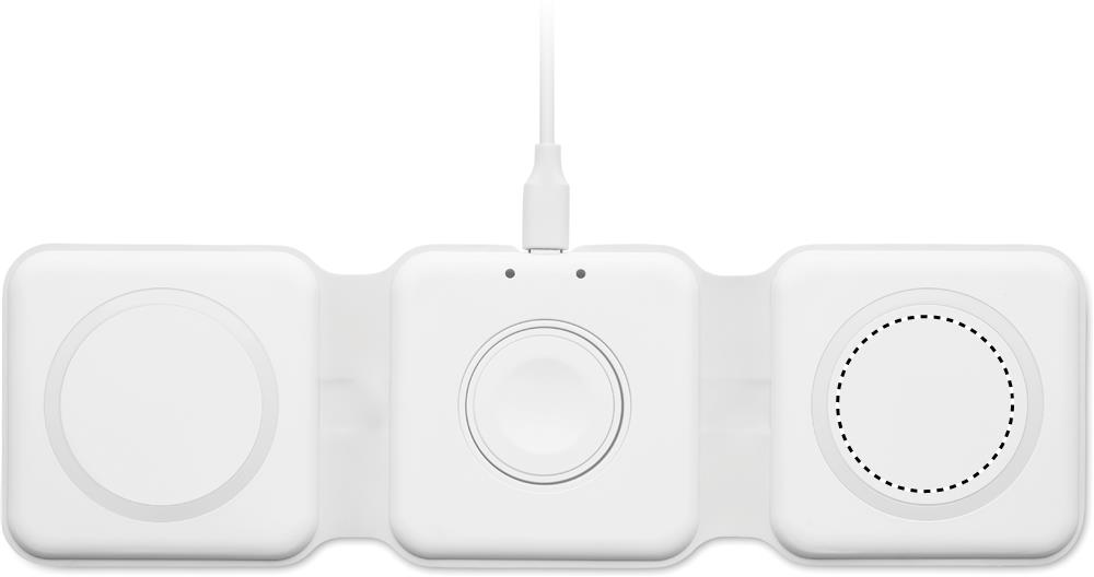 3 i 1 hopfällbar laddningsstation i ABS. Den har 3 trådlösa laddningspunkter. Ingång: 2-i-1 typ-C och typ-A. Kompatibel med alla QI-aktiverade enheter som senaste Android, iPhone® 8, X och nyare. Även kompatibel med iWatch.