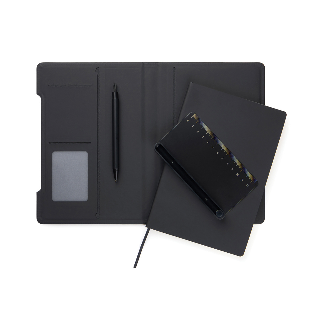 Upptäck den ultimata anteckningsboken som förenklar din vardag med en smart 4-i-1-lösning som kombinerar funktionalitet, flexibilitet och design. Tillverkad av RCS-certifierat återvunnet papper med ett omslag i Baltimores klassiska, matta PU finish gör den lika visuellt tilltalande som funktionell. En magnetisk linjal fungerar som pennhållare och inkluderar en matchande kulspetspenna med blått bläck. Pennhållaren kan enkelt omvandlas till ett mobilställ som är integrerat i anteckningsbokens struktur. Insidan är utrustad med kortfack samt ett utbytbart anteckningsblock för långvarig användning. Blocket innehåller 80 ark / 160 linjerade sidor och erbjuder generöst med utrymme för anteckningar, planering och idéer. Den perfekta följeslagaren för möten, resor och en organiserad vardag. Totalt återvunnet innehåll: 70% baserat på produktens totala vikt. Certifierad av Control Union, CU1162221.