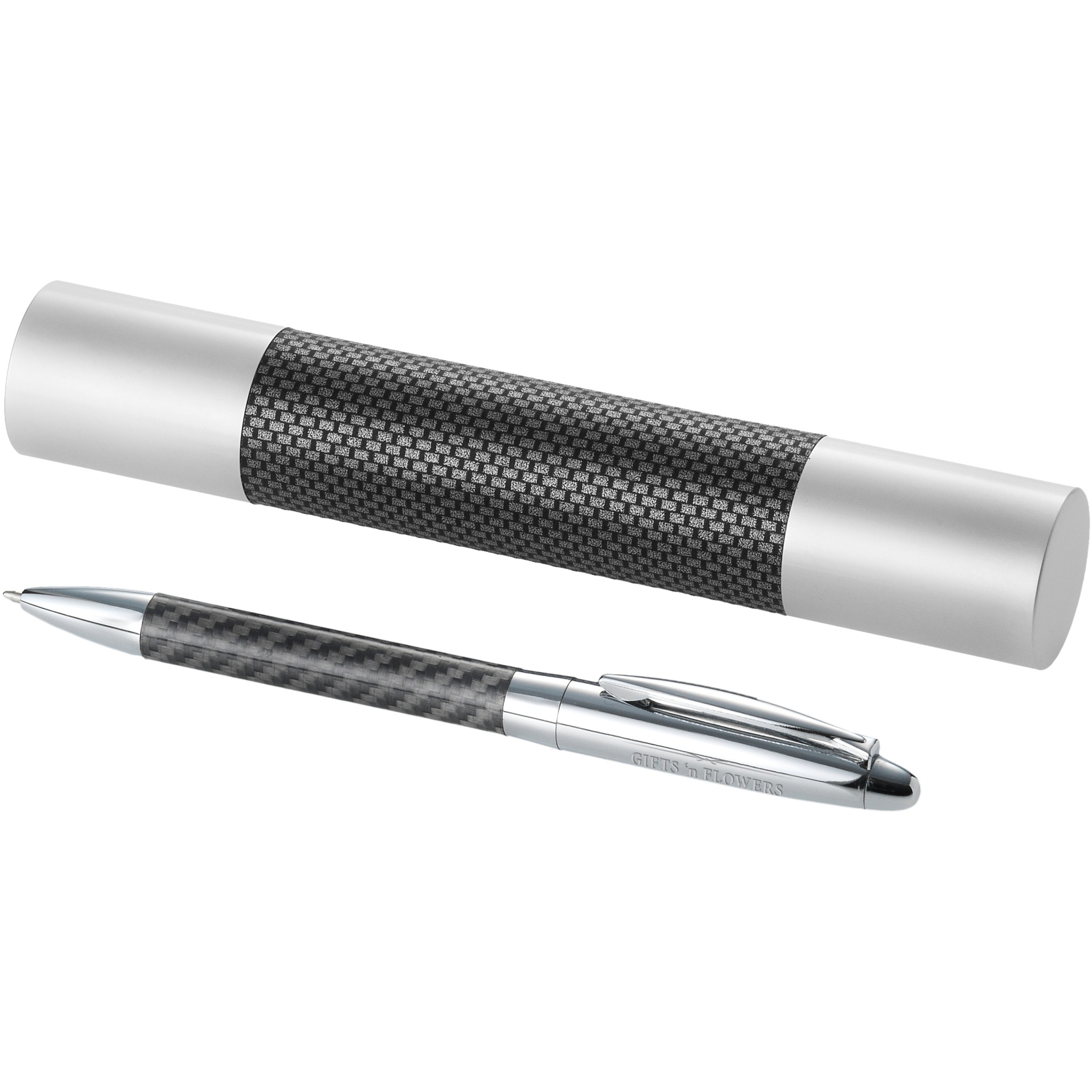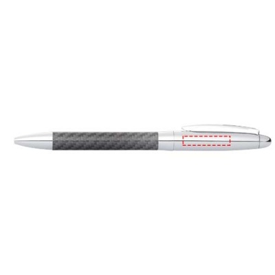 Kulspetspenna med vridmekanism i klassisk design med glänsande överdel och underdel med kolfiberdetaljer. Presentförpackning i form av en cylinder.